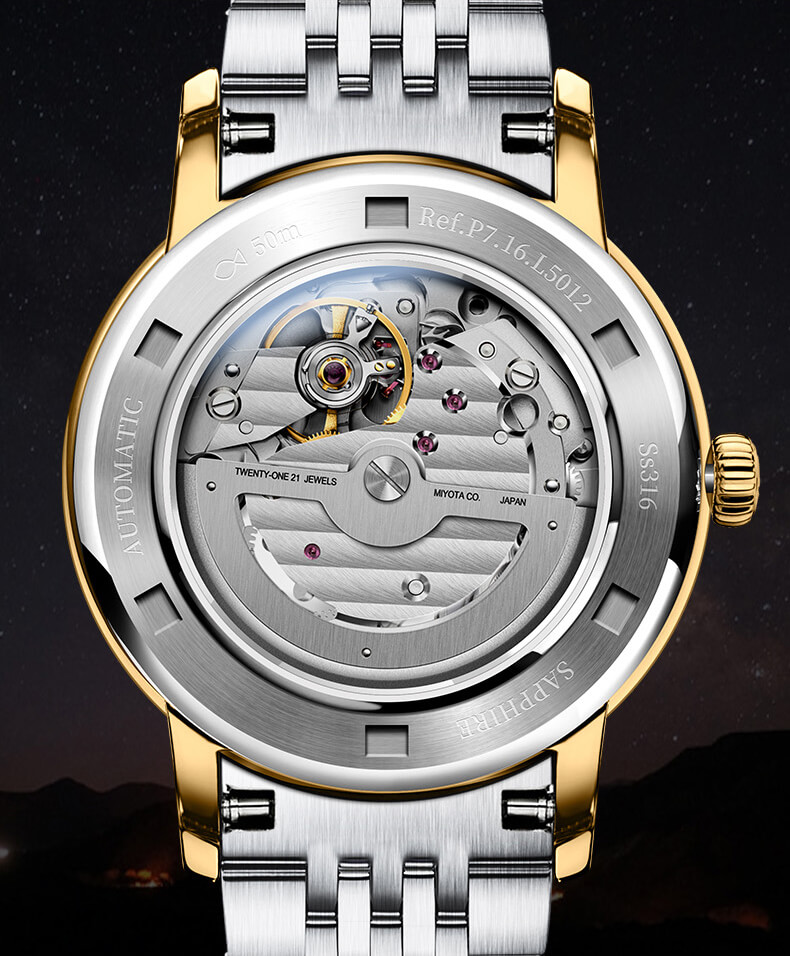 MÁY MIYOTA 8215 MƯỢT MÀ: ĐỘ CHÍNH XÁC CAO - HOẠT ĐỘNG ỔN ĐỊNH - BỀN BỈ, HIỆN ĐẠI, sở hữu 21 chân kính bảo vệ khớp nối, tần số 21.600 giúp đồng hồ vận hành bền bỉ, mượt mà.
