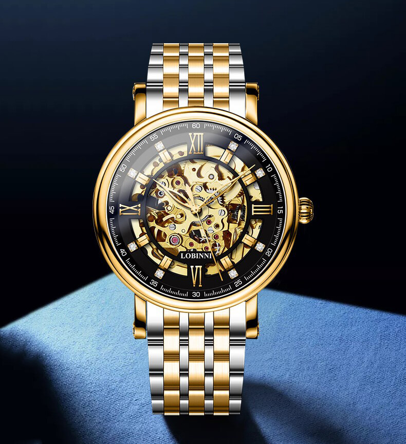 ❏ Vàng hồng 18K: Là vàng nguyên khối, phủ trọn gần như là toàn bộ mặt số đồng hồ LOBINNI L9010. Trong khi đó, sự sang trọng lại được kết hợp với nền tảng Skeleton độc đáo, giúp các quý ông chìm đắm ở cả mặt trước lẫn mặt sau thiết kế.