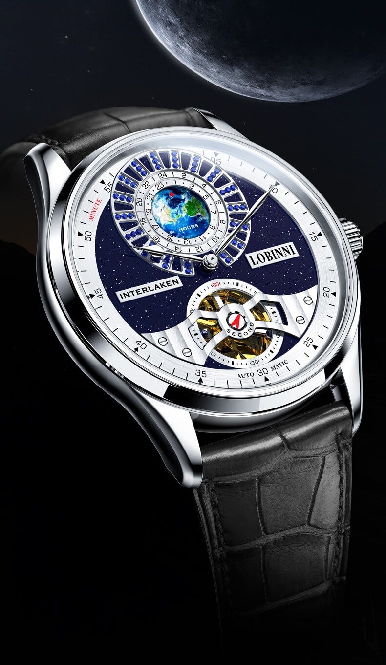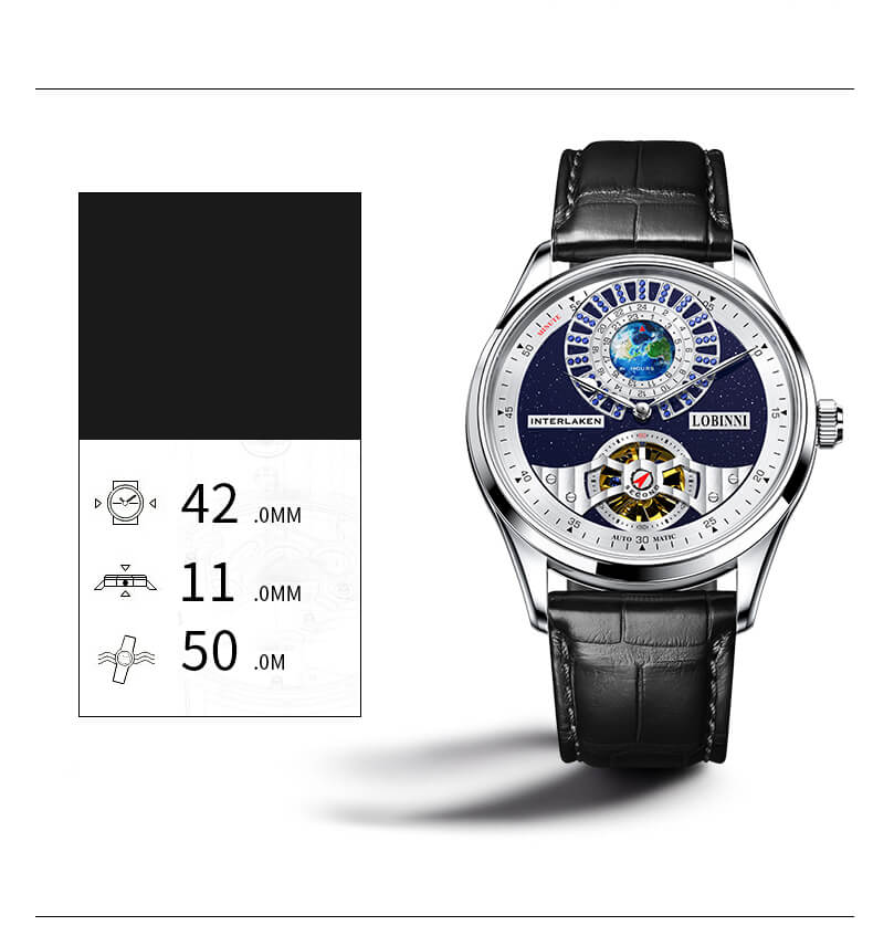 Đồng hồ nam chính hãng LOBINNI Thụy Sỹ Thiết kế sang trọng, đẳng cấp cho quý ông Thời gian trữ cót lâu lên đến 40h Chống nước 5ATM, Kính sapphire Toàn bộ máy được làm