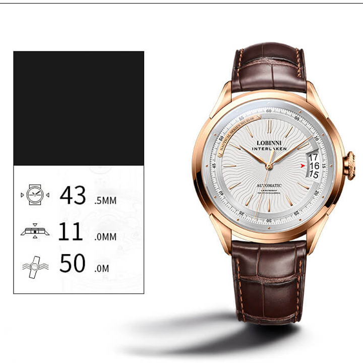 Nhãn hiệu LOBINNI Mã sản phẩm No.9010-1 Giới tính Nam Kiểu máy Automatic (Máy Cơ) Đường kính mặt 42 mm Độ dày 11 mm Chất liệu vỏ Thép không gỉ 316L Chất liệu dây Dây da cao cấp Chất liệu mặt kính Sapphire Khả