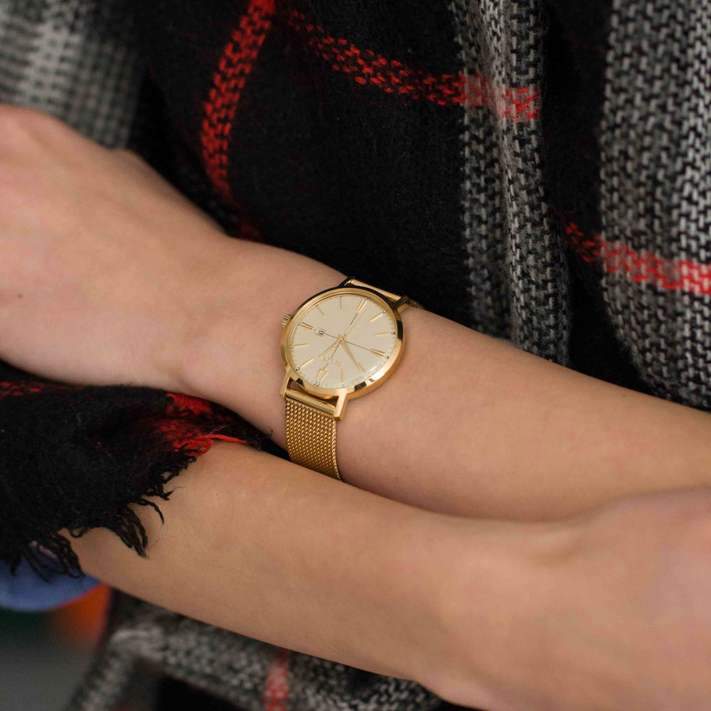 - Vật liệu vỏ / gờ: Sắc vàng kim - Dây đeo bằng da - Mặt kính khoáng - Chống nước - Giờ hiện hành thông thường Đồng hồ kim: 3 kim (giờ, phút, giây)