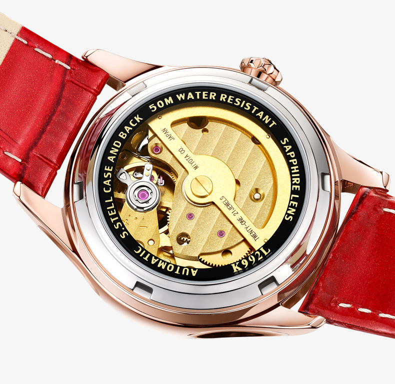 THÔNG SỐ SẢN PHẨM: Mã sản phẩm : K991-1 Giới tính : Nữ Kiểu máy : Automatic (Máy Cơ) Đường kính mặt :  35 mm Độ dày:  9 mm Chất liệu vỏ : Thép không