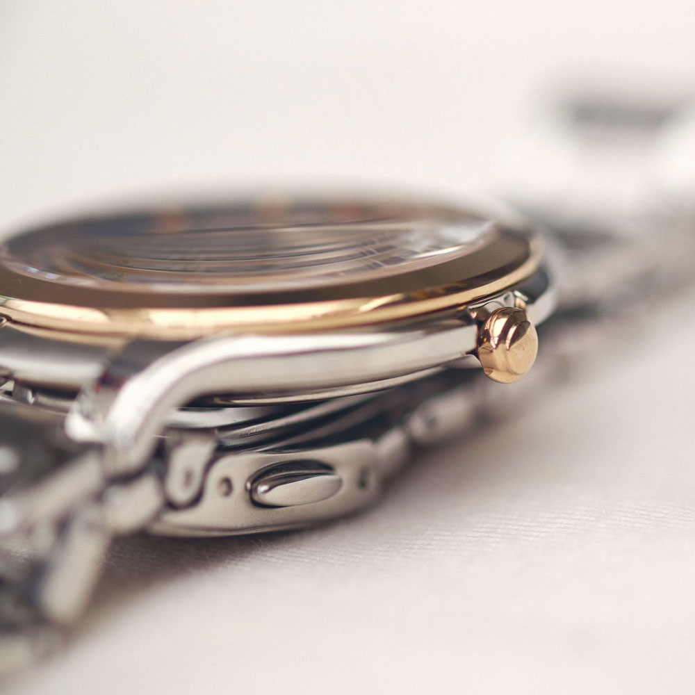 • Đồng hồ được phủ demi vàng hồng bằng công nghệ PVD, không bong tróc.