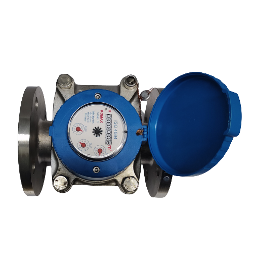 Đồng hồ nước Komax thân gang DN100 mặt bích có thiết kế dạng woltman cho lượng nước thoát qua đồng hồ dễ và thông thoáng hơn, Măt khác bộ chuyển động từ năn cách nước lên