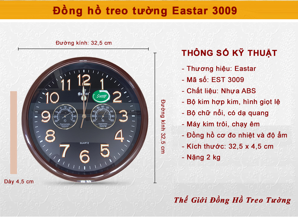 1. THÔNG TIN CHI TIẾT: - Thương hiệu: Eastar. - Loại: Máy Đồng hồ Treo tường Kim dạ quang Công nghệ Thạch anh (Quartz) chạy kim (Analogue), Loại máy đồng hồ kim trôi chạy êm