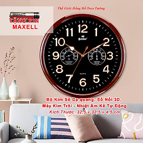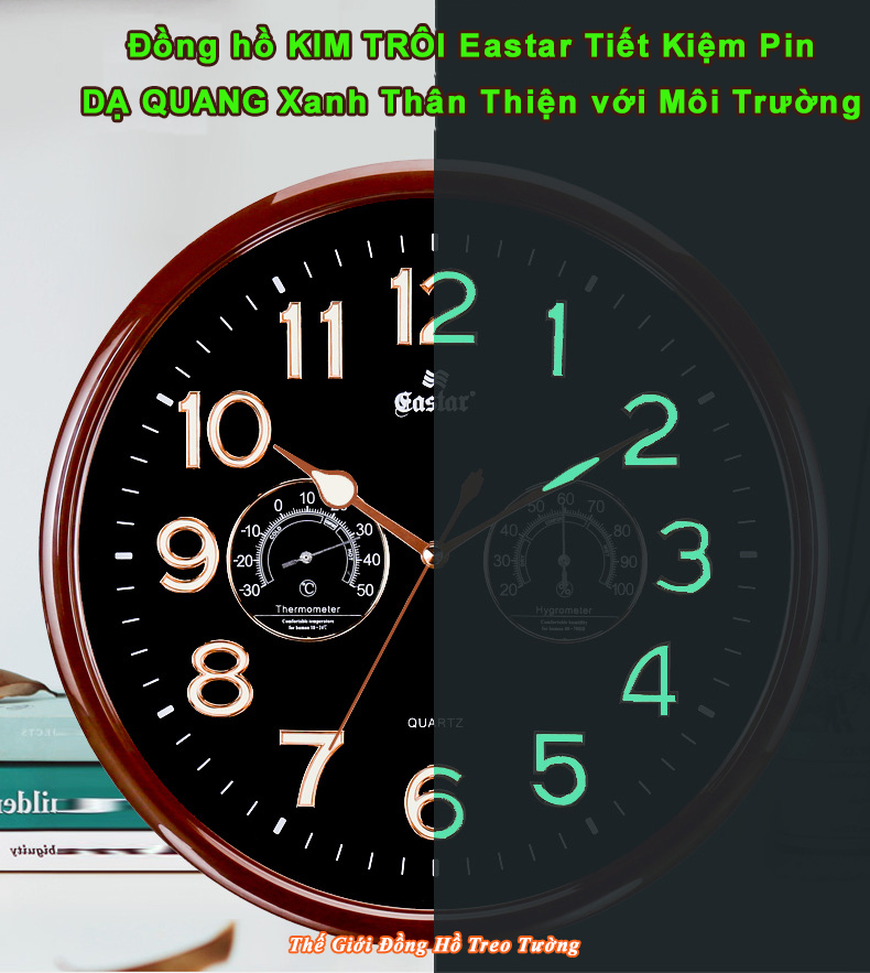 ✨Đồng Hồ Treo Tường Có DẠ QUANG Và NHIỆT ẨM KẾ CƠ (Không Dùng Pin) - Máy EASTAR KIM TRÔI - SỐ NỔI 3D - Tặng Pin Maxell