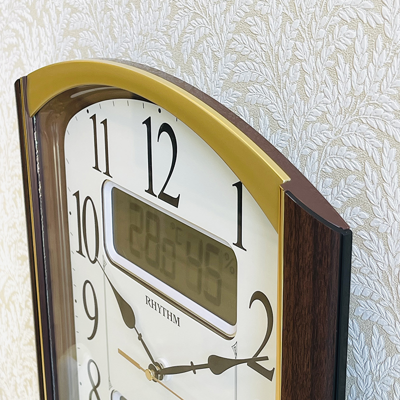 Đồng hồ treo tường Nhật Bản Rhythm CMG876NR18, dùng pin (AA x 1), vỏ nhựa màu vàng / kết hợp mạ vàng sang trọng. Kích thước 31.5 x 4.5cm, trọng lượng 625g. Máy kim trôi