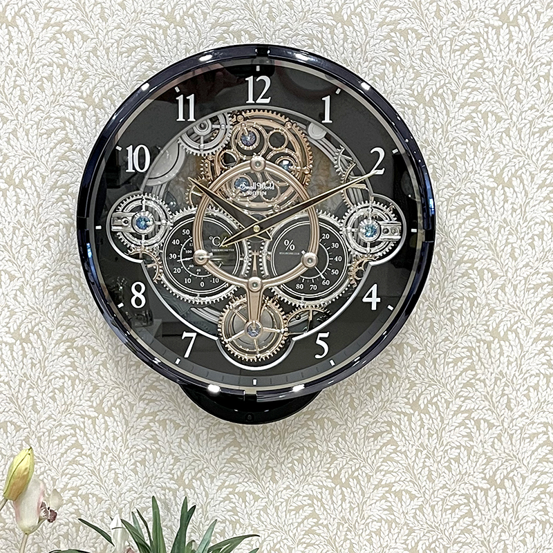 Mua tại TiktokĐồng hồ treo tường Rhythm Magic Motion 4MH886WD02, sử dụng 2 pin (D) Vỏ nhựa cao cấp đen bóng, Kích thước 39.0 x 41.0 x 8.6cm, trọng lượng 2.4kg Âm thanh thính phòng SIP sound in palce với 24 bản nhạc (12 + 12 Melodies),6 bản giáng sinh (X-mas Songs). Cảm ứng ánh sáng điều khiển nhạc Có núm vặn chỉnh âm lượng rất tiện lợi. Các bánh răng trên mặt số đồng hồ xoay tròn khi có nhạc. Trục các bánh răng trên mặt số được cẩn đá pha lê xanh. 2 đồng hồ nhỏ ngay vị trí trung tâm thể hiện nhiệt độ và độ ẩm.