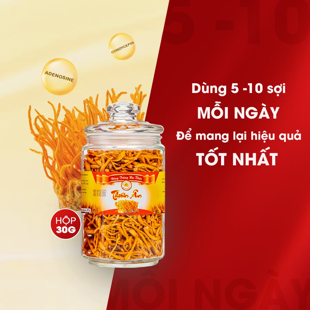 Mua tại TiktokĐông trùng hạ thảo sấy thăng hoa Thiên Ân 30 gram là sản phẩm được sấy thăng hoa từ đông trùng hạ thảo tươi, đảm bảo giữ được 99% hàm lượng dược chất. Quy cách đóng gói: Hũ thủy tinh 30g Sản phẩm được cấp chứng nhận Hàng Việt Nam Chất Lượng Cao do Hội Doanh Nghiệp Hàng Việt Nam Chất Lượng Cao cấp. Sản phẩm đạt tiêu chuẩn FDA xuất khẩu sang Mỹ
