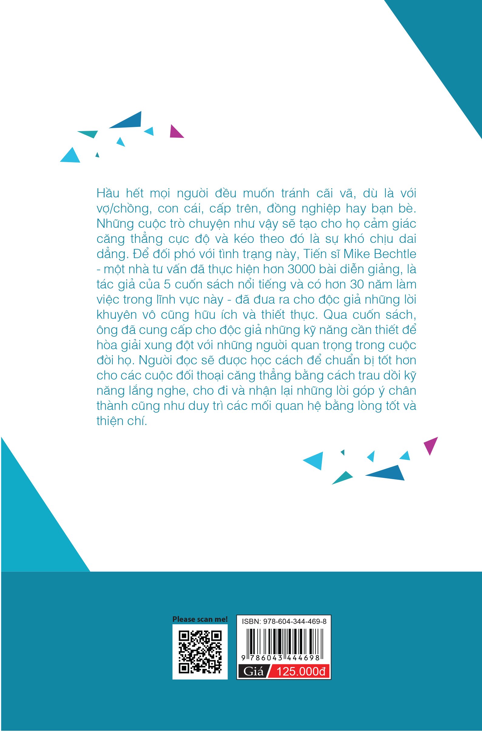 TÁC GIẢ Tiến sĩ Mike Bechtle hiện đang là giảng viên tại Đại học của bang Arizona, Mỹ. Ngoài việc giảng dạy tại trường Đại học, ông còn là một diễn giả nổi tiếng vởi rất nhiều bài phát biểu hay. Đồng thời ông cũng là tác giả của nhiều cuốn sách bán chạy có thể kể đến như: Đừng để cảm xúc thôi miên lý trí (People Can’t Drive You Crazy If You Don’t Give Them the Key; I Wish He Had Come With Instructions, How To Communicate With C) NỘI DUNG Trong các mối quan hệ, hầu hết mọi người đều muốn tránh khỏi những cãi vã không thực sự cần thiết, dẫu là trong quan hệ vợ/ chồng, con cái, đồng nghiệp, cấp trên, xã giao, bạn bè… Nhưng đồng thời, sự kìm nén cảm xúc, hay cố tình lờ đi, vờ như không biết, sở dĩ “một điều nhịn là chín điều lành” tránh điều tiếng. Tuy nhiên những cuộc trò chuyện như vậy sẽ tạo cho ta cảm giác căng thẳng cực độ, và nếu kéo dài sẽ là sự khó chịu dai dẳng. Để đối phó với tình trạng này, Tiến sĩ Mike Bechtle - một nhà tư vấn đã thực hiện hơn 3000 bài diễn giảng, là tác giả của 5 cuốn sách nổi tiếng và có hơn 30 năm làm việc trong lĩnh vực này - đã đưa ra cho độc giả những lời khuyên vô cũng hữu ích và thiết thực. Qua cuốn sách “Đừng để mâu thuẫn nhỏ gây hậu quả lớn”, ông đã cung cấp cho độc giả những kỹ năng cần thiết để hòa giải xung đột với những người quan trọng trong cuộc đời họ. Người đọc sẽ được học cách để chuẩn bị tốt hơn cho các cuộc đối thoại căng thẳng bằng cách trau dồi kỹ năng lắng nghe, cho đi và nhận lại những lời góp ý chân thành cũng như duy trì các mối quan hệ bằng lòng tốt và thiện chí.