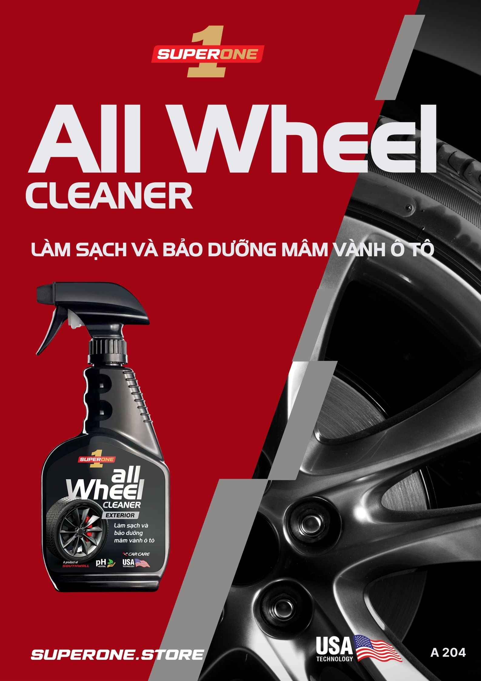 LÀM SẠCH VÀ BẢO DƯỠNG MÂM VÀNH Ô TÔ   Dung Dịch Làm Sạch Bảo Dưỡng Mâm Vành Ô Tô Super One All Wheel Cleaner - Exterior là sự lựa chọn tối ưu cho việc chăm sóc chiếc xế yêu của bạn. Với khả năng dễ dàng làm sạch bụi phanh, bụi đất và các vết bẩn cứng đầu bám trên vành mâm xe, sản phẩm này giúp duy trì vẻ đẹp hoàn hảo cho bộ mâm của bạn. Không chỉ ngăn chặn sự tích tụ của các vết bẩn đáng khó chịu, mà còn loại bỏ rỉ sét đáng ghét bám má phanh và giảm tiếng kêu của phanh đĩa. Với thành phần không axit, sản phẩm không gây ăn mòn cho kim loại và hoàn toàn an toàn cho da tay của bạn. Super One All Wheel Cleaner còn giúp phục hồi độ sáng bóng cho vành mâm xe, tạo nên một diện mạo hoàn hảo cho phần ngoại thất của chiếc xe. Dễ dàng sử dụng và mang lại hiệu quả rõ ràng, Super One All Wheel Cleaner là một phần không thể thiếu trong bộ sản phẩm chăm sóc ô tô của bạn.   Đặc Tính Sản Phẩm