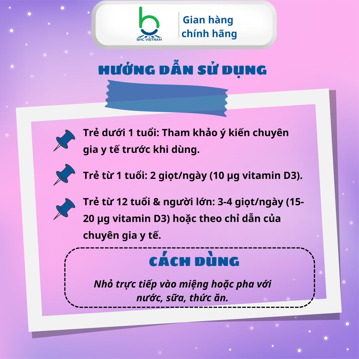 Hướng Dẫn Sử Dụng: Trẻ dưới 1 tuổi: Tham khảo ý kiến chuyên gia y tế trước khi dùng. Trẻ từ 1 tuổi: 2 giọt/ngày (10 µg vitamin D3). Trẻ từ 12 tuổi & người lớn: 3-4 giọt/ngày (15-20 µg vitamin D3) hoặc theo chỉ dẫn của chuyên gia y tế. Cách dùng: • Nhỏ trực tiếp vào miệng hoặc pha với nước, sữa, thức ăn.