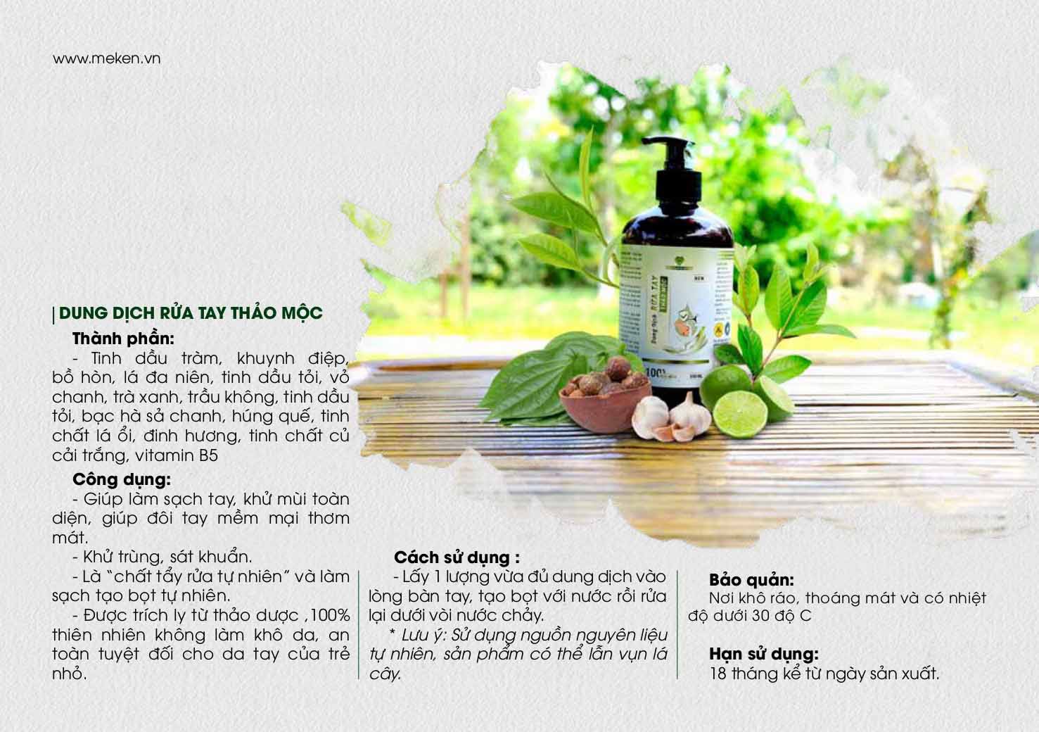 DUNG DỊCH RỬA TAY THẢO MỘC SÁT KHUẨN MẸ KEN * Thành phần: Tinh dầu tràm, khuynh điệp, bồ hòn, lá đa niên, tinh dầu tỏi, vỏ chanh, trà xanh, trầu không, tinh dầu tỏi, bạc