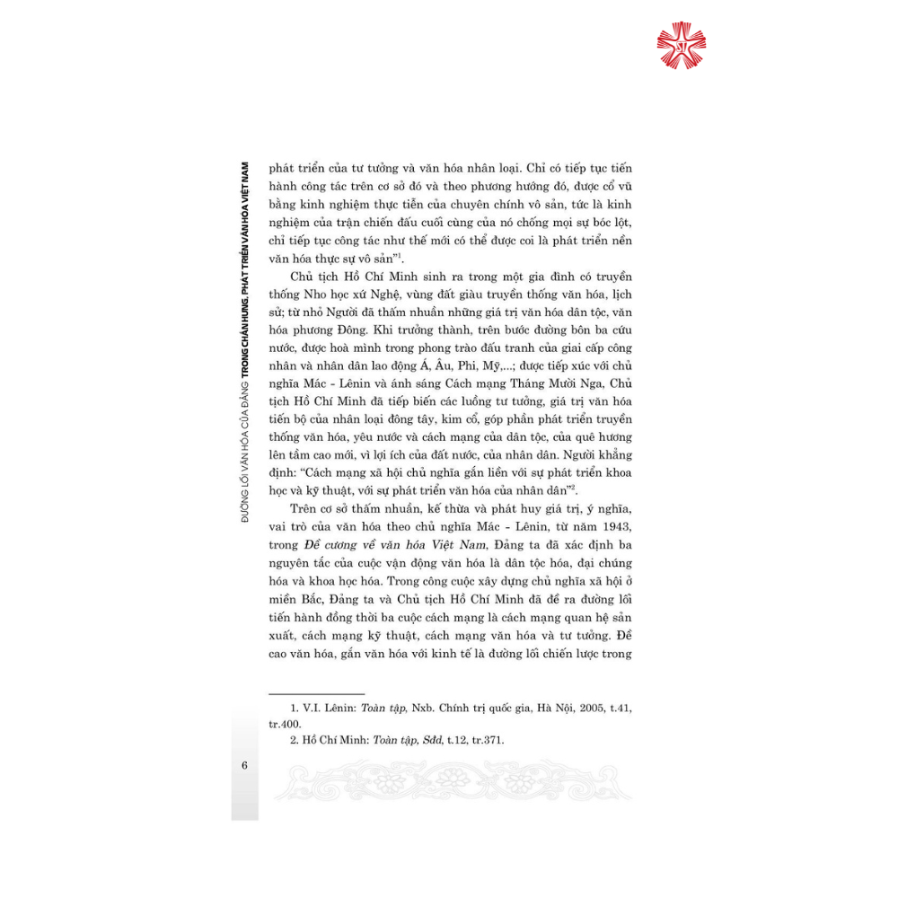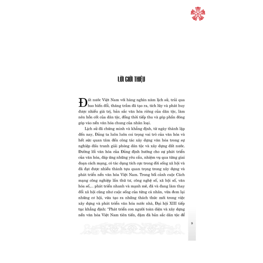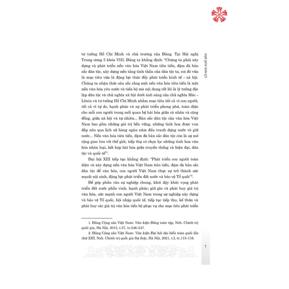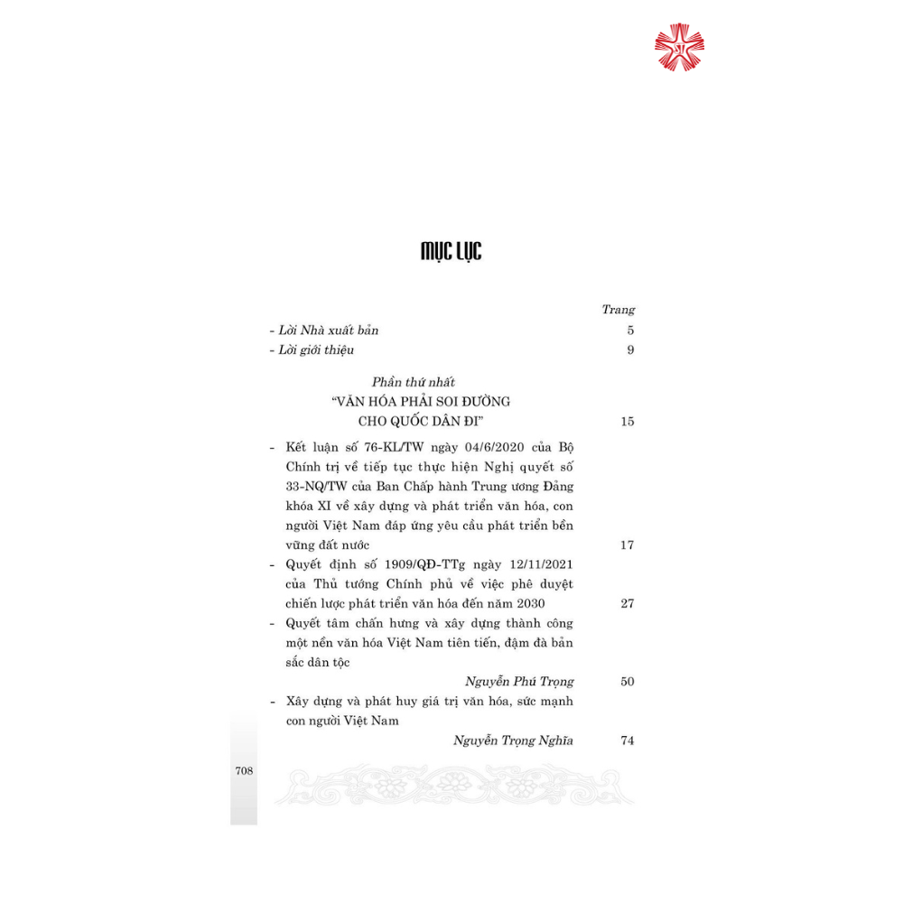 Nội dung gồm các văn bản chỉ đạo mới của Đảng, Nhà nước về chủ trương, đường lối văn hóa trong bối cảnh mới; toàn văn bài viết, phát biểu của Tổng Bí thư Nguyễn Phú Trọng tại Hội nghị văn hóa toàn quốc, tháng 11/2021. Cùng với các bài viết lý luận về xây dựng hệ giá trị văn hóa Việt Nam trong giai đoạn mới và việc tổ chức thực hiện ở một số cơ quan, bộ, ngành, địa phương…