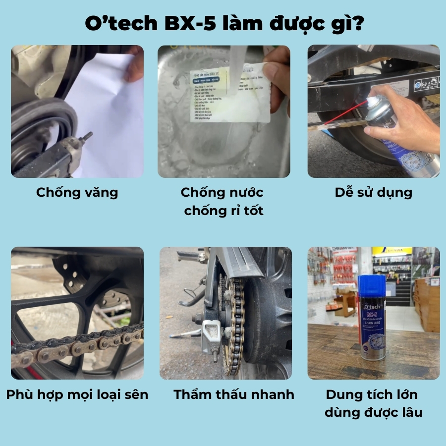- Vừa thay sên chưa lâu nhưng đã kêu lại như cũ? Đừng vội thay sên mới! Hãy thử Xịt Dưỡng Sên O’TECH BX-5 – sản phẩm được hàng ngàn người dùng tin tưởng giúp phục hồi, bôi trơn và bảo vệ sên tối đa, kéo dài tuổi thọ và giúp xe chạy êm ru! 5 LÝ DO NÊN CÓ NGAY 1 BÌNH BX-5 TRONG NHÀ Làm êm sên ngay lập tức Giảm tiếng kêu khó chịu chỉ sau một lần xịt. Cảm nhận rõ sự trơn tru mỗi khi đề-pa hoặc tăng tốc. Chống gỉ – Bảo vệ sên mọi lúc mọi nơi Đi mưa, ngập nước, để ngoài trời... không còn là nỗi lo. Dầu tạo màng chắn chống oxy hoá hiệu quả. Không văng dầu – Không dính bánh, phuộc, áo quần Kết cấu bám dính đặc biệt giúp dầu nằm gọn trên sên, không gây bẩn các bộ phận khác. Tiết kiệm chi phí sửa chữa Sên bền hơn, nhông đĩa ít mòn hơn → Giảm chi phí thay mới và công bảo dưỡng định kỳ. Sử dụng dễ dàng – Ai cũng có thể tự làm Không cần đem xe ra tiệm, chỉ cần vài thao tác đơn giản là bạn đã có thể chăm sóc sên như thợ chuyên nghiệp. THÔNG SỐ SẢN PHẨM