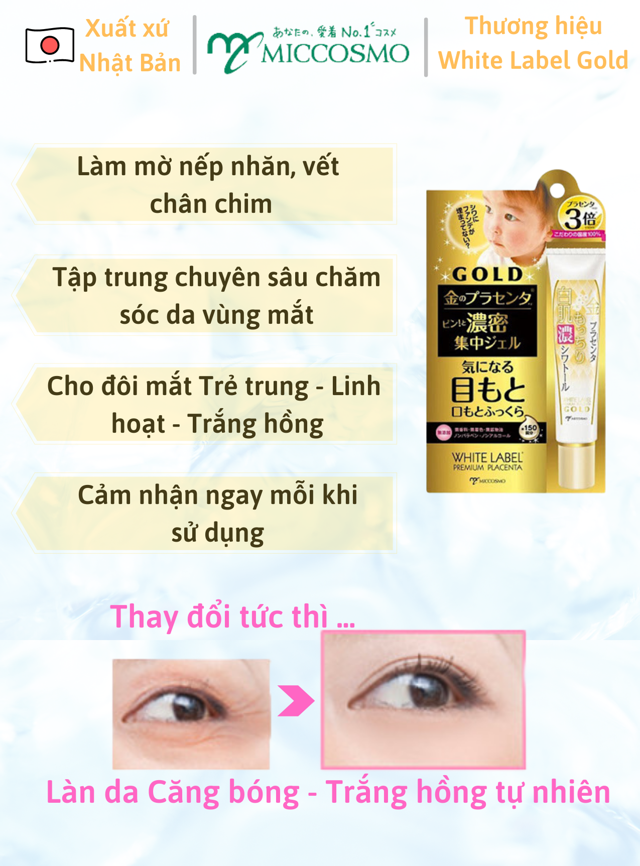 Chăm sóc vùng mắt cùng WHITE LABEL GOLD EYE GEL MICCOSMO| Kem trị thâm tốt nhất Nhật Bản | Dawata 86
