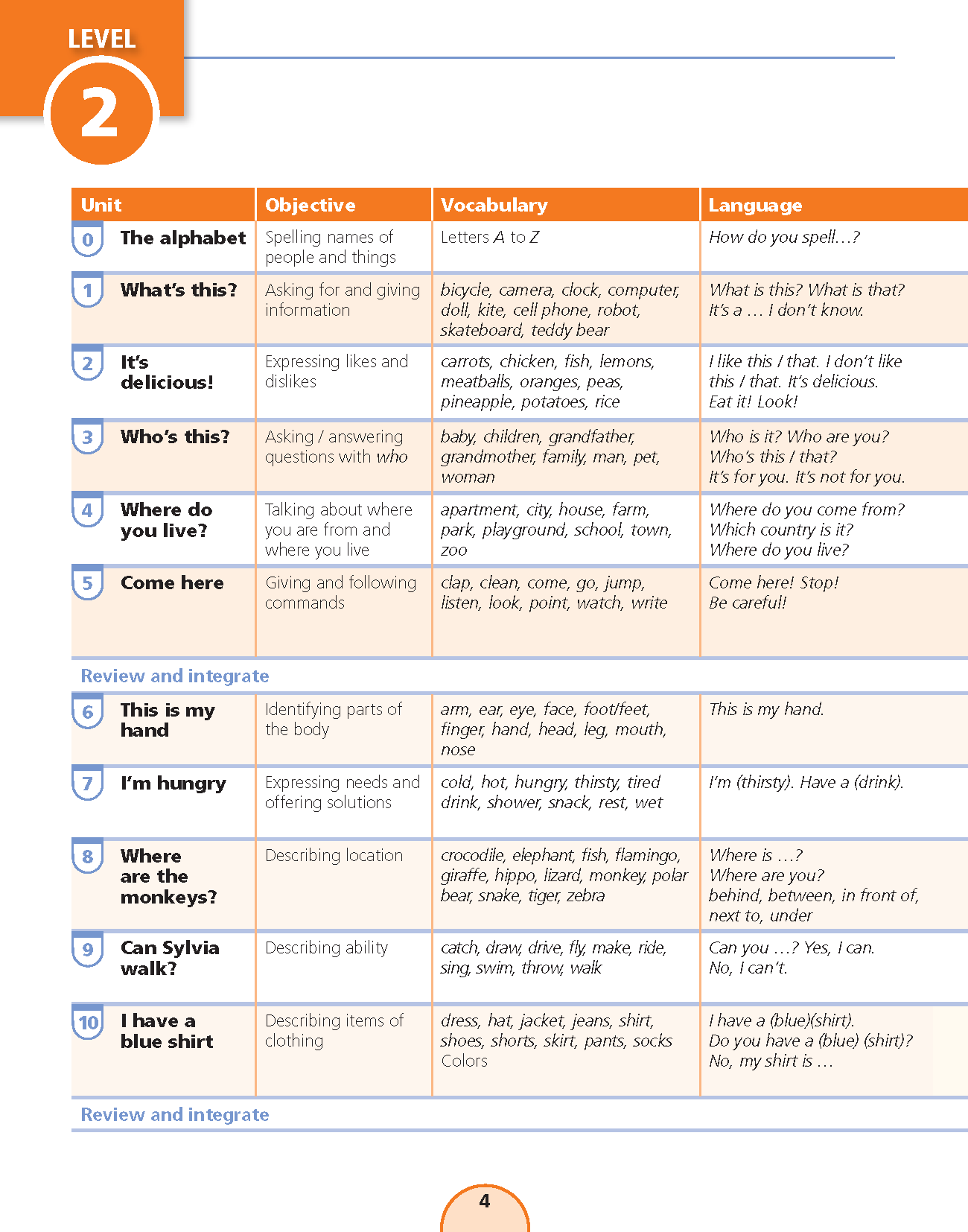 Sách: Learning English 4 - Dành Cho Học Sinh Lớp 4 NỘI DUNG VÀ CẤU TRÚC CỦA QUYỂN SÁCH : Bảng mục lục: Chỉ rõ các mục tiêu chính và trọng tâm của mỗi bài