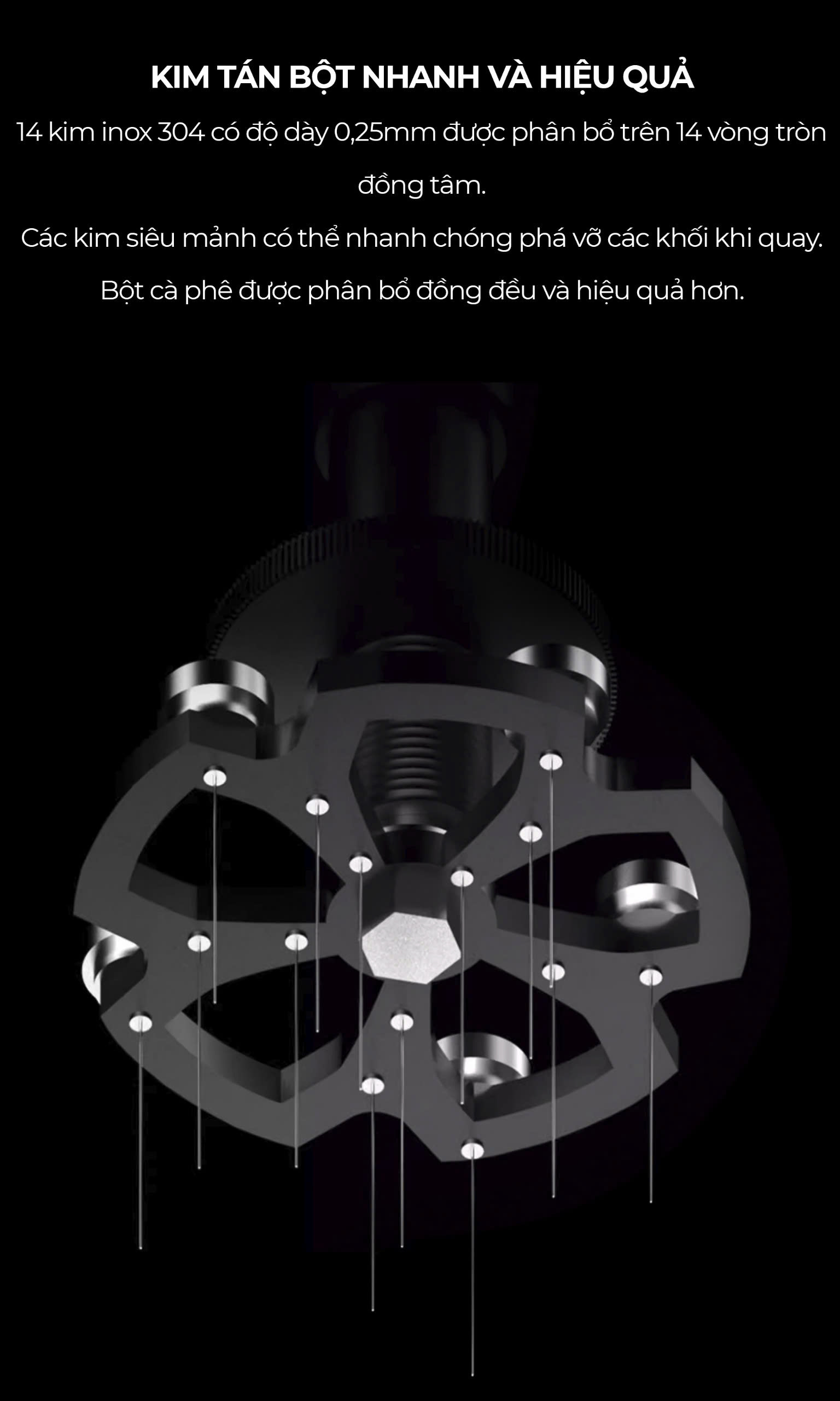 ️ Hệ thống 14 kim inox 304 siêu mảnh, dày 0,25mm sắp xếp theo 14 vòng tròn đồng tâm, giúp phân bổ bột tối ưu, hạn chế kênh rãnh (channeling).
