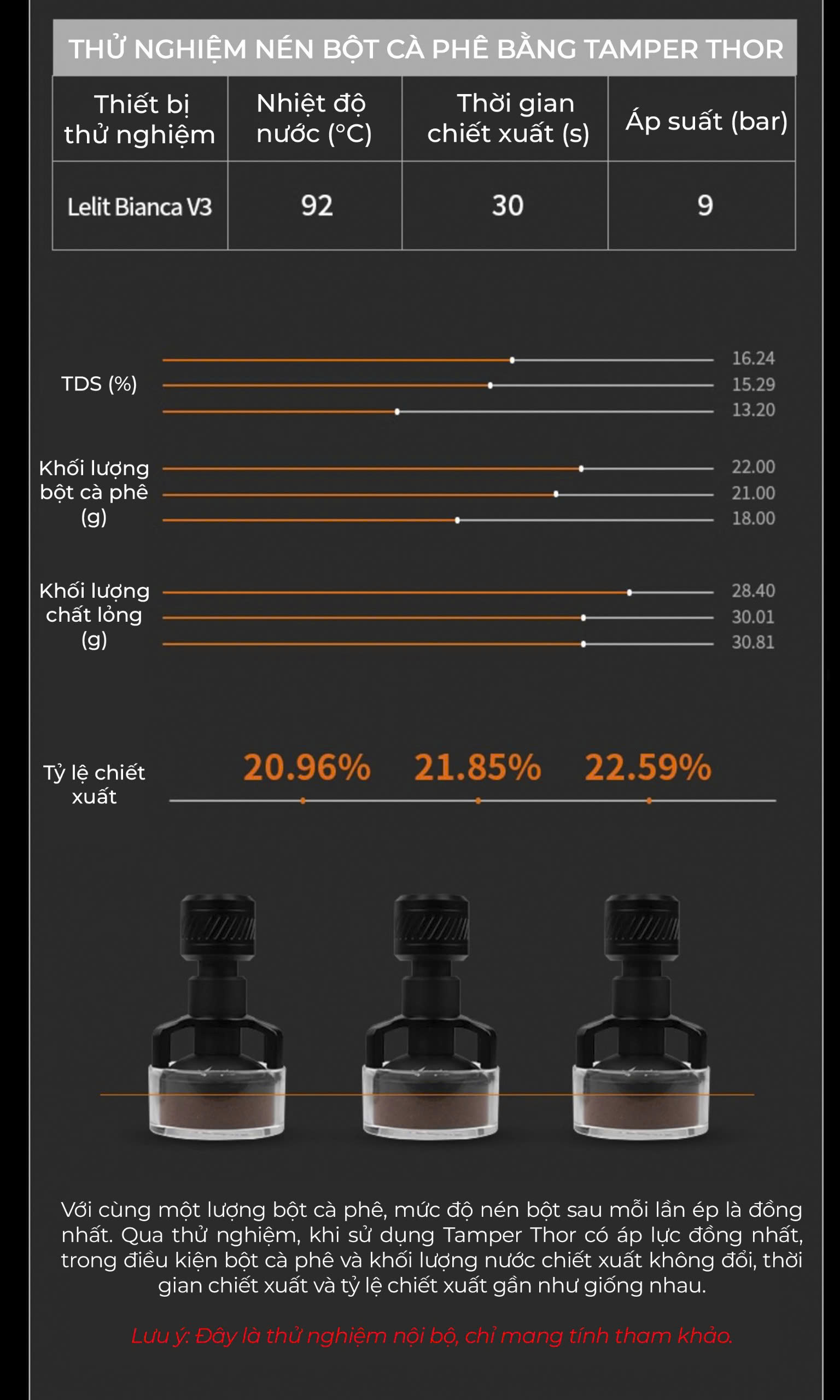 Tamper THOR cố định lực cân bằng, với thiết kế cơ học thông minh, thiết kế ren xoắn ốc và lực nén chuẩn 30lbs (~13.6kg), Tamper THOR giúp bạn: