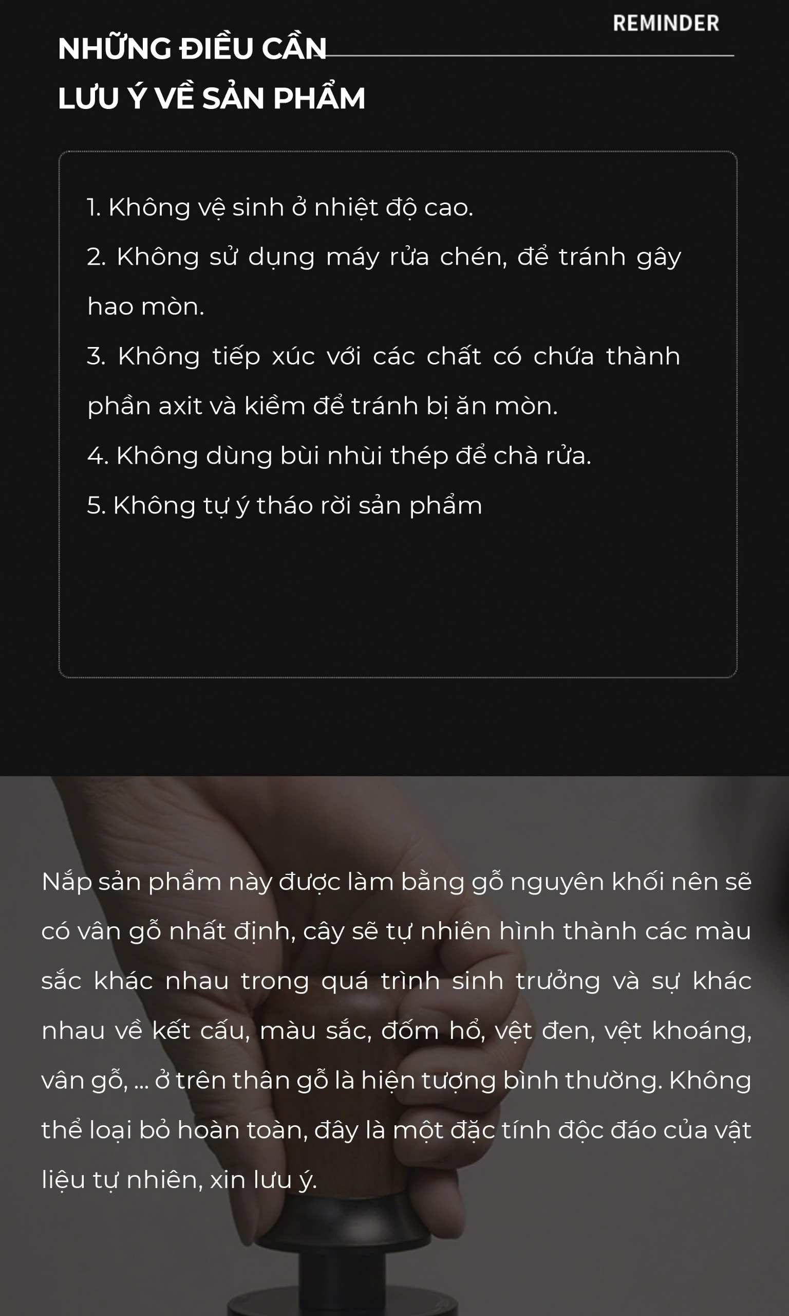 • Nắp sản phẩm này được làm bằng gỗ nguyên khối nên sẽ có vân gỗ nhất định, cây sẽ tự nhiên hình thành các màu sắc khác nhau trong quá trình sinh trưởng và sự khác nhau về kết cấu, màu sắc, đốm hổ, vệt đen, vệt khoáng, vân gỗ, ... ở trên thân gỗ là hiện tượng bình thường. Không thể loại bỏ hoàn toàn, đây là một đặc tính độc đáo của vật liệu tự nhiên.
