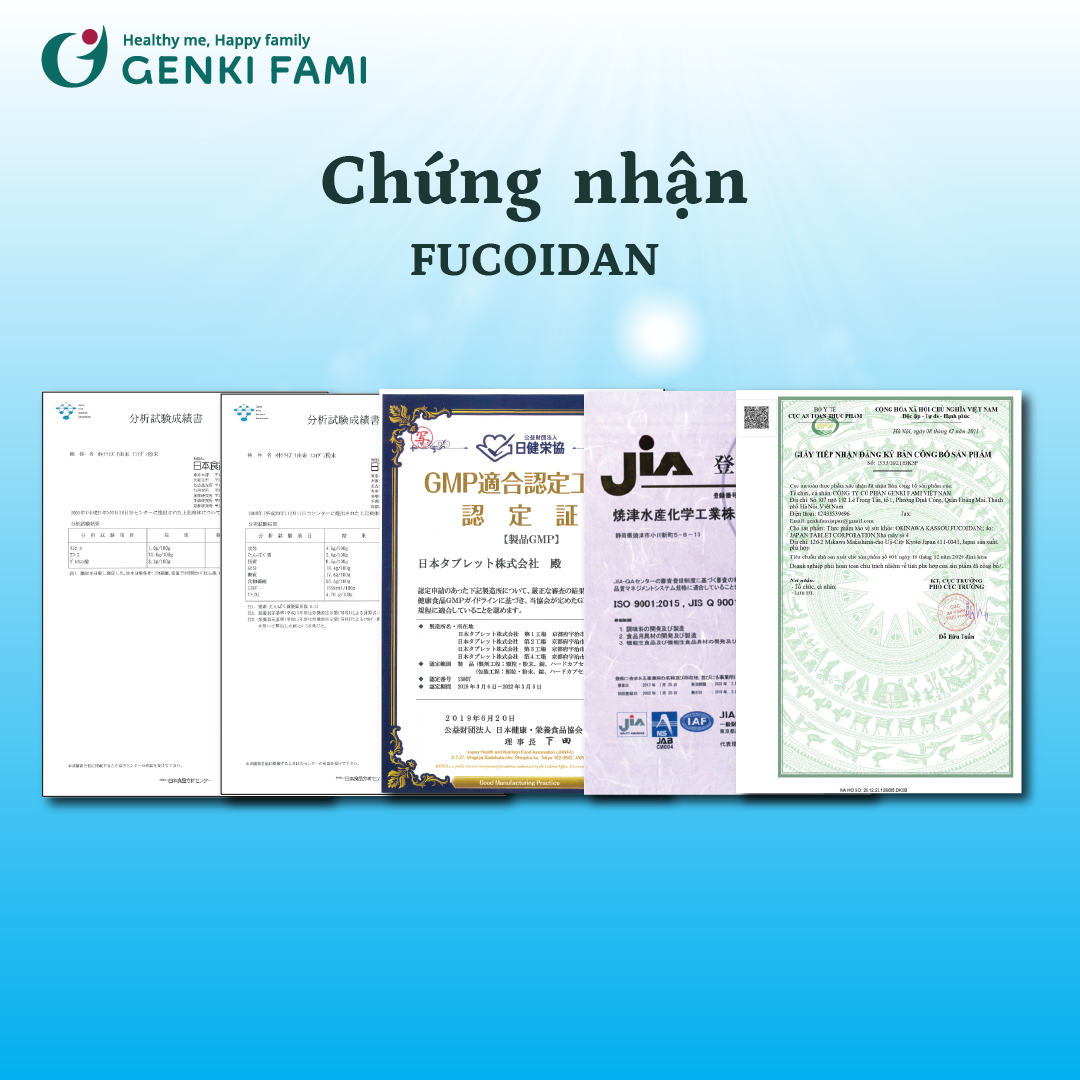 - Người bệnh ung thư có thể sử dụng Fucoidan để tăng cường đề kháng và giảm tác dụng phụ đối với cơ thể. QUY CÁCH SẢN PHẨM: Số lượng viên/ hộp: 150 viên/ hộp Hạn sử dụng: 36 tháng kể từ ngày sản xuất, hạn sử dụng được in trên bao bì sản phẩm. Uống 5 viên/ ngày cùng nước sôi để nguội hoặc nước ấm, uống với nhiều nước. NGUỒN GỐC VÀ XUẤT XỨ: Xuất xứ: Nhật Bản Thương hiệu: Genki Fami Nhập khẩu và phân phối chính hãng bởi Công ty Cổ phần Genki Fami Việt Nam Chứng nhận công bố sản phẩm của Bộ Y tế số: 1333/2021/ĐKSP.