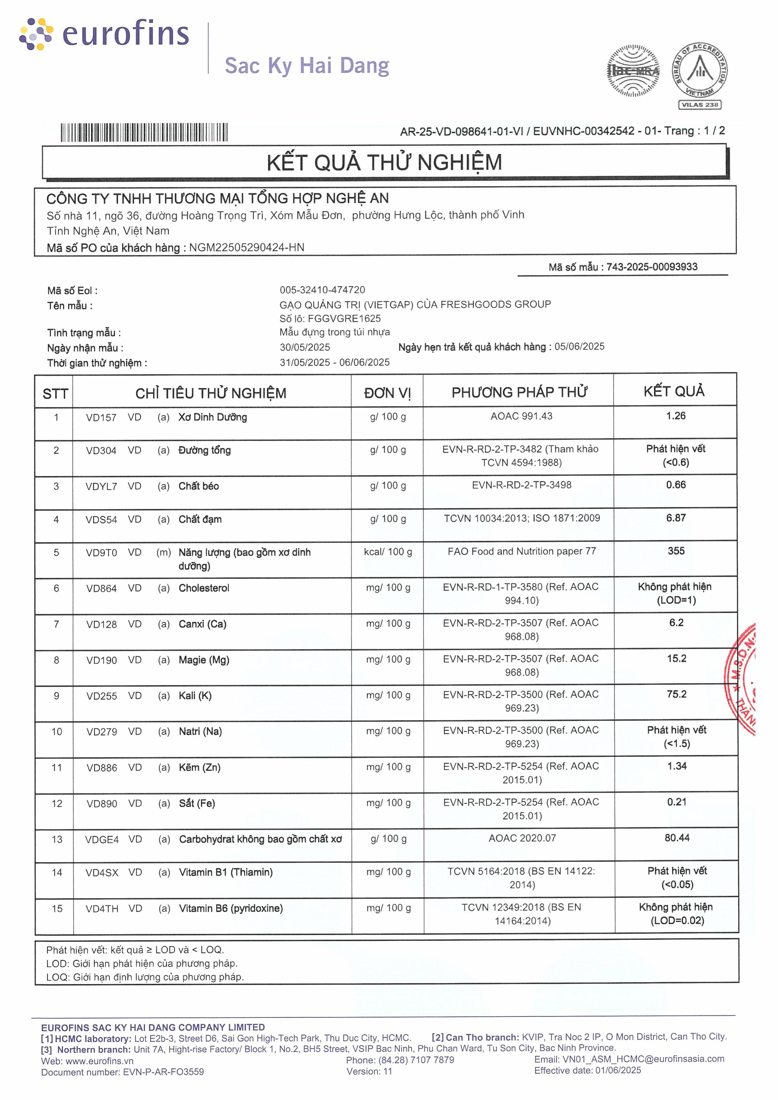 - Hướng dẫn sử dụng và bảo quản sản phẩm: xin vui lòng xem thông tin chi tiết ở mặt sau bao bì sản phẩm 11. Bảng so sánh thành phần dinh dưỡng giữa gạo hữu cơ Quảng trị của Freshgoods Group và các loại gạo trắng khác: STT Thành phần dinh dưỡng Đơn vị Gạo hữu cơ Quảng Trị của Freshgoods Group Gạo trắng khác (Nguồn: . ) Tỷ lệ giá trị dinh dưỡng giữa gạo hữu cơ quảng trị của Freshgoods group và gạo trắng 1 Protein g/100 g 8.03 7.04 1,14 2 Lipid g/100 g 0,72 1,03 0,70 3 Canxi g/100 g 6 4 1,5 4 Carbonhydrat không bao gồm chất xơ g/100 g 76,35 80,30 0,95 5 Xơ dinh dưỡng g/100g 1,27 0,10 12,70 6 Sắt (Fe) Mg/100 g 0,22 0,14 1,57 7 Magie (Mg) Mg/100 g 16,30 26,50 0,62 8 Kali (K) Mg/100 g 77,60 82 0,95 9 Kẽm (Zn) Mg/100 g 1,12 1,35 0,83 10 Năng lượng Kcal/100 g 344 359 0,96