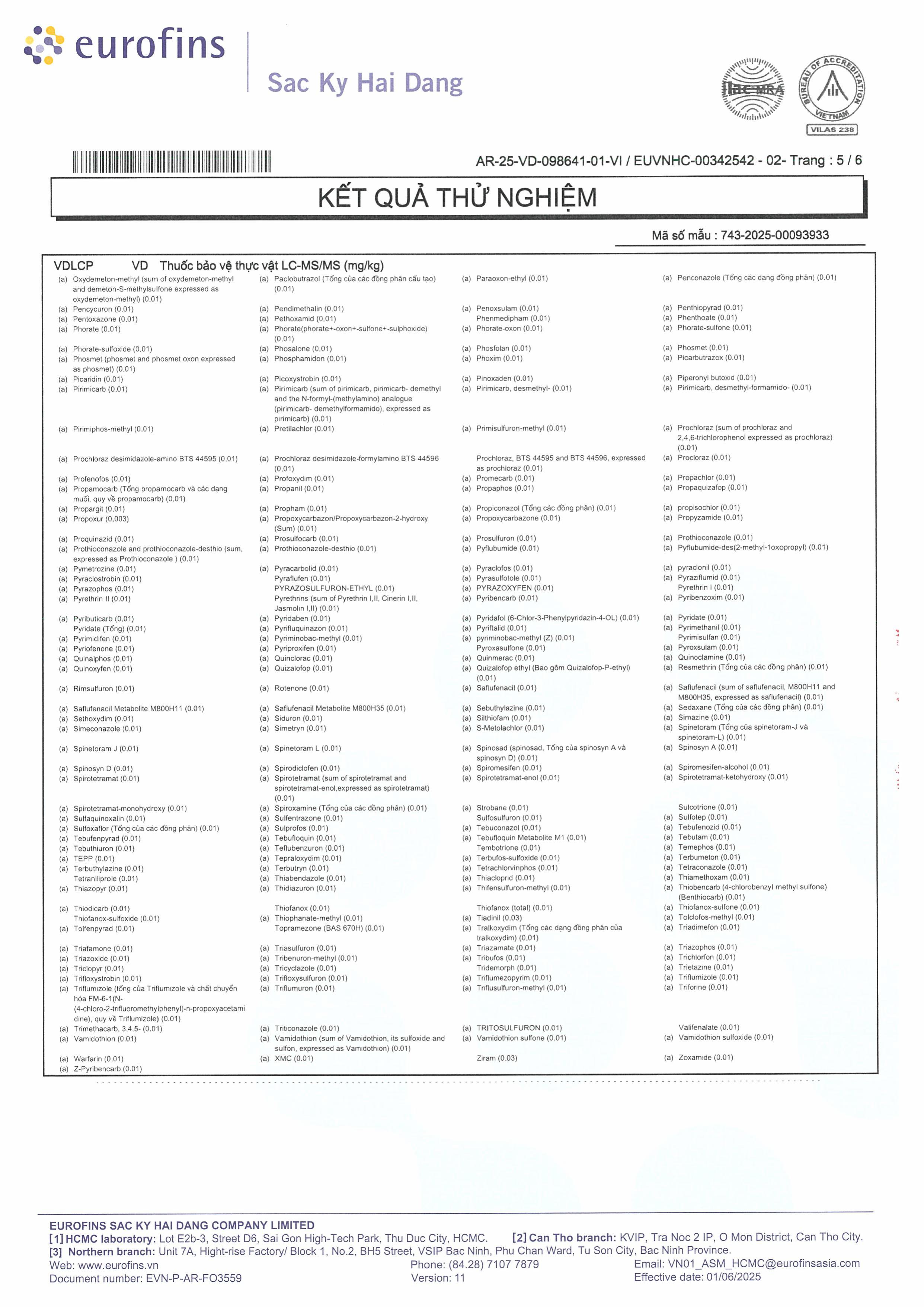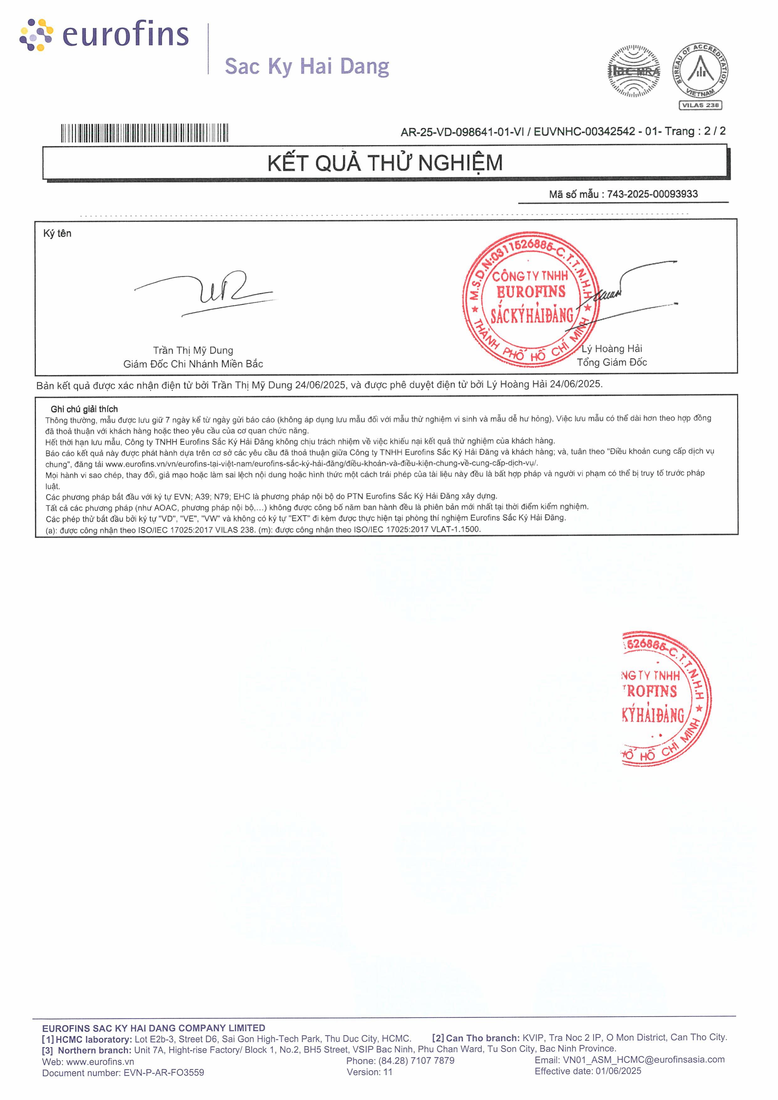 - Đáp ứng các tiêu chuẩn về dư lượng thuốc bảo vệ thực vật, kim loại nặng và các chỉ tiêu an toàn thực phẩm khác của Liên minh Châu Âu (EU). (Kết quả thử nghiệm của Eurofin đính kèm)