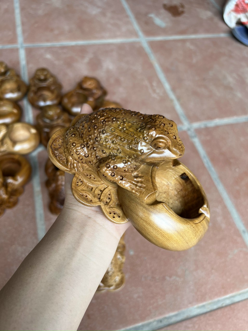 _ Gạt tàn điêu khắc con cóc vô cùng tỉ mỉ ,tinh sảo kỳ công .Đi hầu hết tất cả mọi chi tiết góc ngách nội dung hoa văn của tượng đều được ngọt tỉa chỉnh sửa hoàn toàn bằng tay thủ công .Đồng thời gạt tàn được kiểm định kỹ lưỡng như cho vào thẩm sấy cho gỗ khô kiệt .Mục đích trống dập nứt vênh mo mối mọt .Kết hợp với trà nhám đánh giấy giáp kỹ nhiều nước rồi cho vào phun lót làm bóng mờ .Để giữ lại mầu sắc vân gỗ tự nhiên .Gạt tàn được làm và hoàn thiện do bàn tay khối óc tài hoa ,Từ những người thợ giàu kinh nghiệm ,Cũng như tay nghề cao trong làng nghề truyền thống .Chính vì thế gạt tàn đã đáp ứng đầy đủ những tiêu trí ( Đẹp bền rẻ ) Thẩm mỹ nghệ thuật với chất lượng tuyệt vời