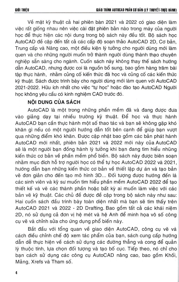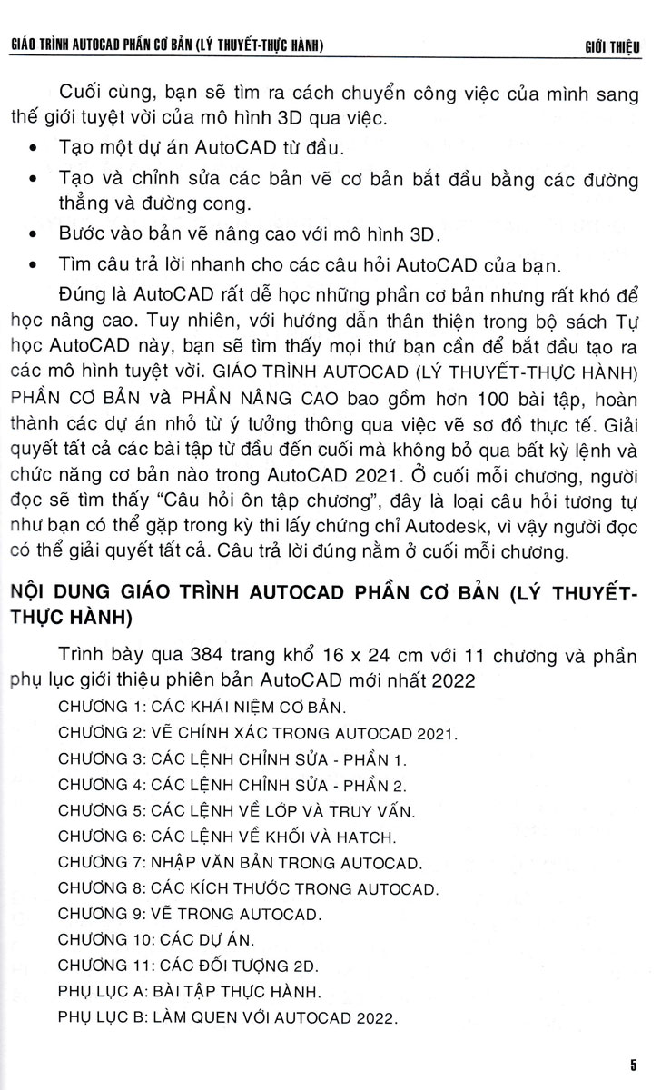 Trong đó 4 cuốn đầu trình bày cả lý thuyết và bài tập, quyển thứ năm trình bày chủ yếu là bài tập thực hành. Các tập từ 1 đến 5 được thực hiện trên phiên bản AutoCAD 2021, tập 6 thực hiện trên phiên bản mới nhất của AutoCAD đó là AutoCAD và AutoCAD 3D 2022.