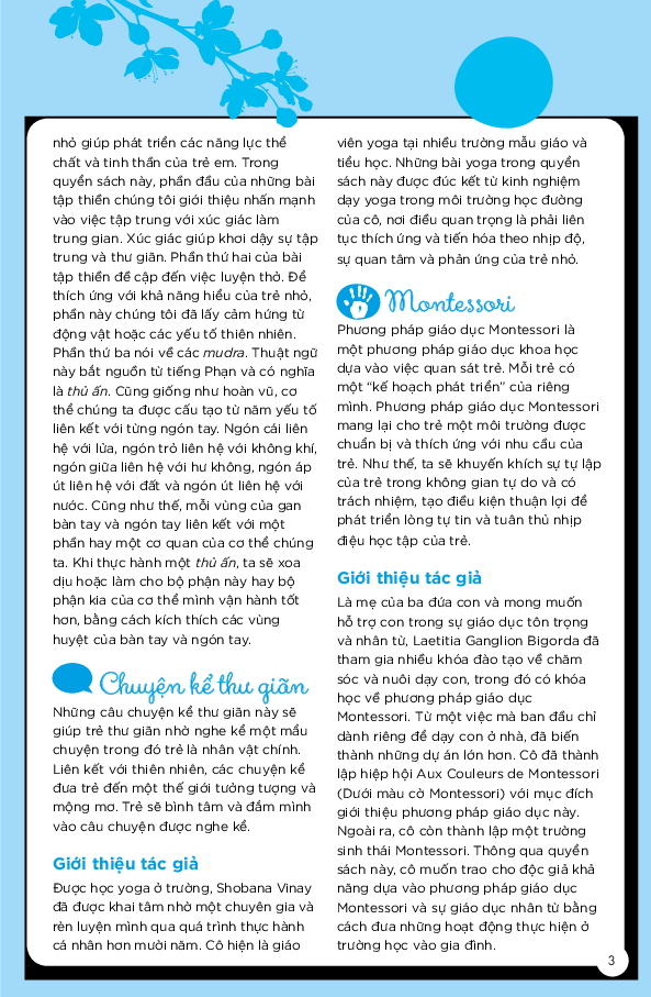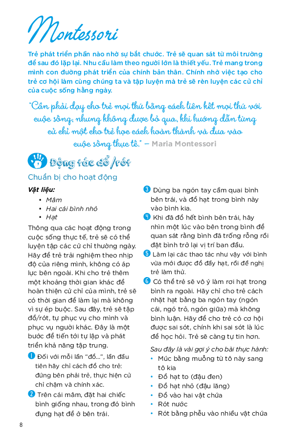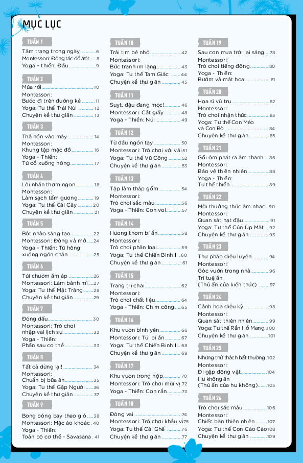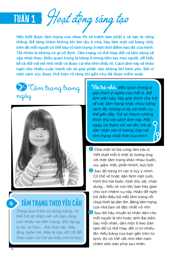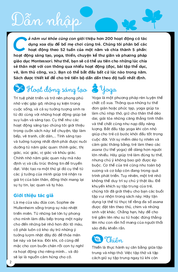Mua tại Tiktok"Cả năm vui khỏe cùng con" thuộc bộ sách "Giúp con hạnh phúc" đã thống kê hơn 200 hoạt động có tác dụng làm tâm trí thư thái để bố mẹ chơi cùng con. Các hoạt động được phân bổ theo 52 tuần và chia thành 5 phần: hoạt động sáng tạo, thiền, kể chuyện và phương pháp giáo dục Montessori. Như thế, bố mẹ sẽ có thể lựa chọn ưu tiên cho những lúc chia sẻ thân mật với con thông qua nhiều hoạt động (đọc truyện, tập thể dục, vẽ, làm thủ công, ). Cả nhà có thể bắt đầu bất cứ lúc nào trong năm. Sách thiết kế theo lộ trình giúp trẻ tiến bộ dần dần theo từng mức độ xác định.