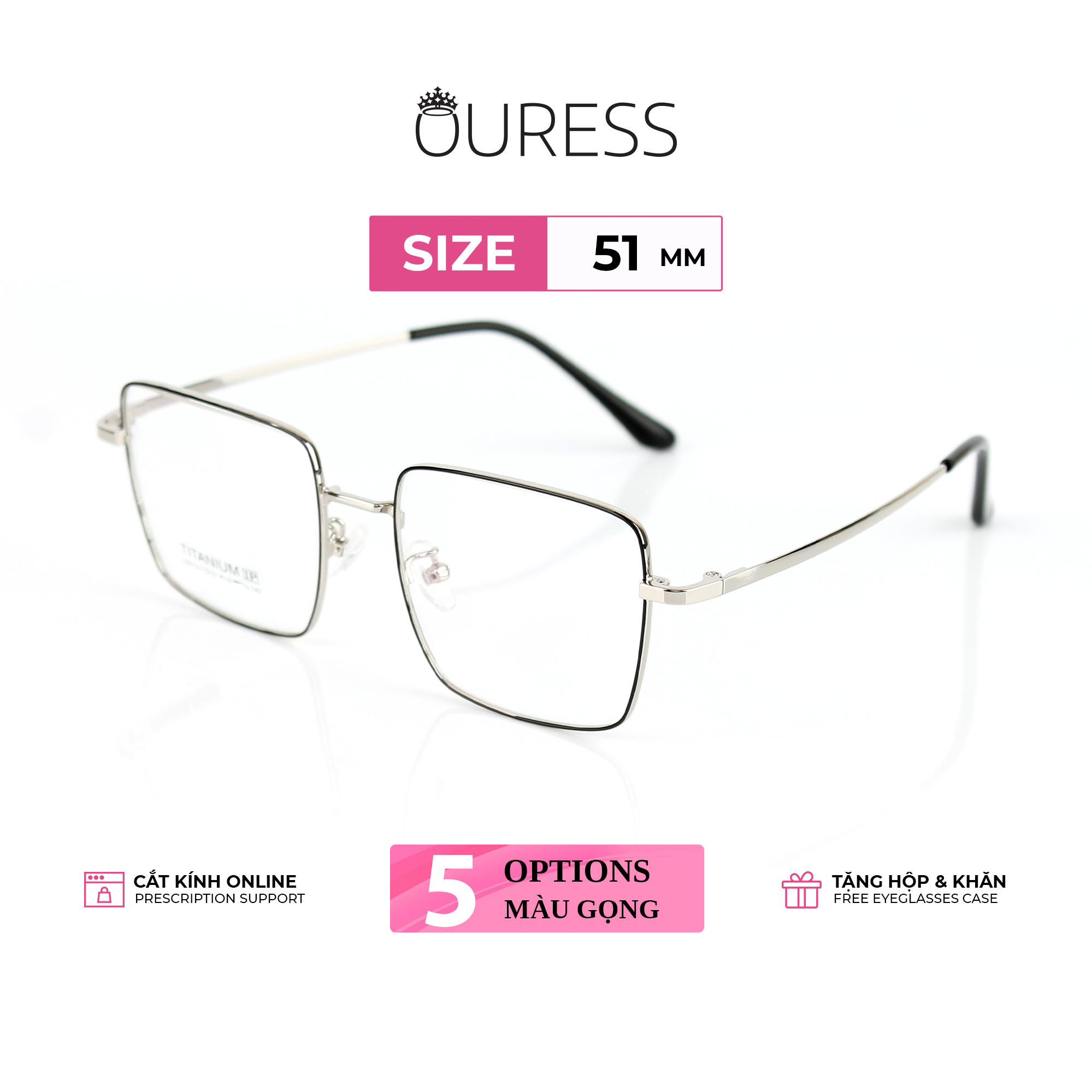 HƯỚNG DẪN CÁCH ĐỌC THÔNG SỐ GỌNG KÍNH: Thông thường, nhà sản xuất sẽ in thông số trên tròng kính hoặc càng kính để người dùng hình dung về các kích thước của gọng kính. Ví dụ, trên tròng kính bạn thấy một dãy số: 16597 53-17-144 •16597: là mã gọng kính • 53: ngang khung tròng kính là 53mm • 17 : cầu mũi là 17 mm • 144 : chiều dài càng kính 144 mm •Cao kính : 50 mm •Chiều ngang tổng thể gọng kính: 140 mm ++ Mã này là size kính dành cho gương mặt vừa và to vừa . *** tỷ lệ chênh lệch thông số +/- 2mm. Qúy khách có thể liện hệ shop để được tư vấn chọn gọng kính phù hợp với size gương mặt mình nhé vì đây chỉ là thông số tham khảo —-------------------------------------- Bộ phụ kiện đi kèm theo Kính Ouress gồm: -Khăn lau kính và hộp đựng kính ( bộ phụ kiện này không áp dụng cho những sản phẩm sale trên 40% )