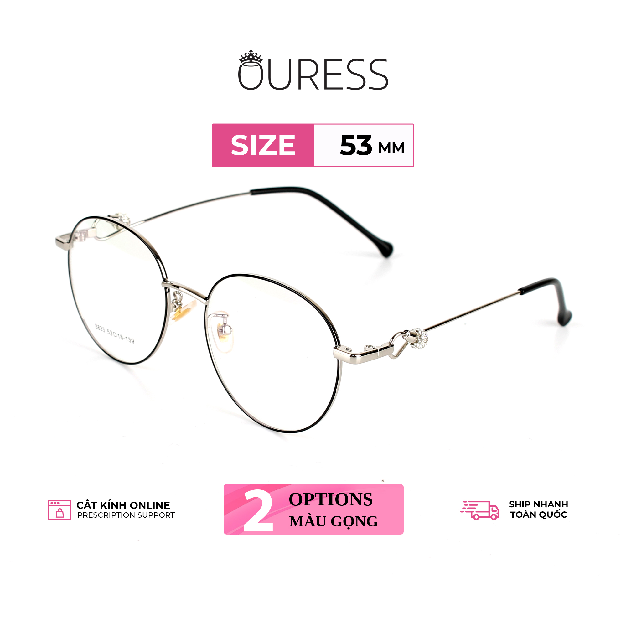- Giá tròng phía trên là GIÁ 1 CẶP TRÒNG KÍNH Bộ phụ kiện : Hộp đựng kính ko đi kèm chung với sản phẩm này. —-------------------------------------- GỌNG KÍNH CẬN HỢP KIM NAM NỮ THỜI TRANG - OURESS • Càng kính dày dặn, chắc chắn, cũng cùng chất liệu hợp kim. Cuối chân kính bọc nhựa giúp người mang không đau ở vành tai, thoải mái mang cả ngày, kể cả khi đội mũ bảo hiểm ôm sát đầu. • Chống xước tối ưu –Chống trượt, chống gãy hiệu quả. • Đệm mũi trong suốt có thể tùy chỉnh. • Thiết kế unisex, thời trang, đa dạng mẫu mã, phù hợp cho cả nam và nữ. • Đủ form trendy cho bạn chọn: tròn ngố, lục giác, mắt mèo, tròn bầu,… —-------------------------------------- HƯỚNG DẪN CÁCH ĐỌC THÔNG SỐ GỌNG KÍNH Thông thường, nhà sản xuất sẽ in thông số trên tròng kính hoặc càng kính để người dùng hình dung về các kích thước của gọng kính. Ví dụ, trên tròng kính bạn thấy một dãy số: 8001 52[]18-142, thì hiểu như sau: • 8001 là mã gọng kính • Số 52 phía trước ô vuông [], là kích thước tròng kính (chiều ngang). Trong ví dụ là 52mm. • Số 18 phía sau ô vuông [], là kích thước cầu nối hai tròng mắt, thường gọi là cầu kính. Trong ví dụ là 18mm • Số 142 là kích thước càng kính. Trong ví dụ là 142mm (=14,2cm) —--------------------------------------