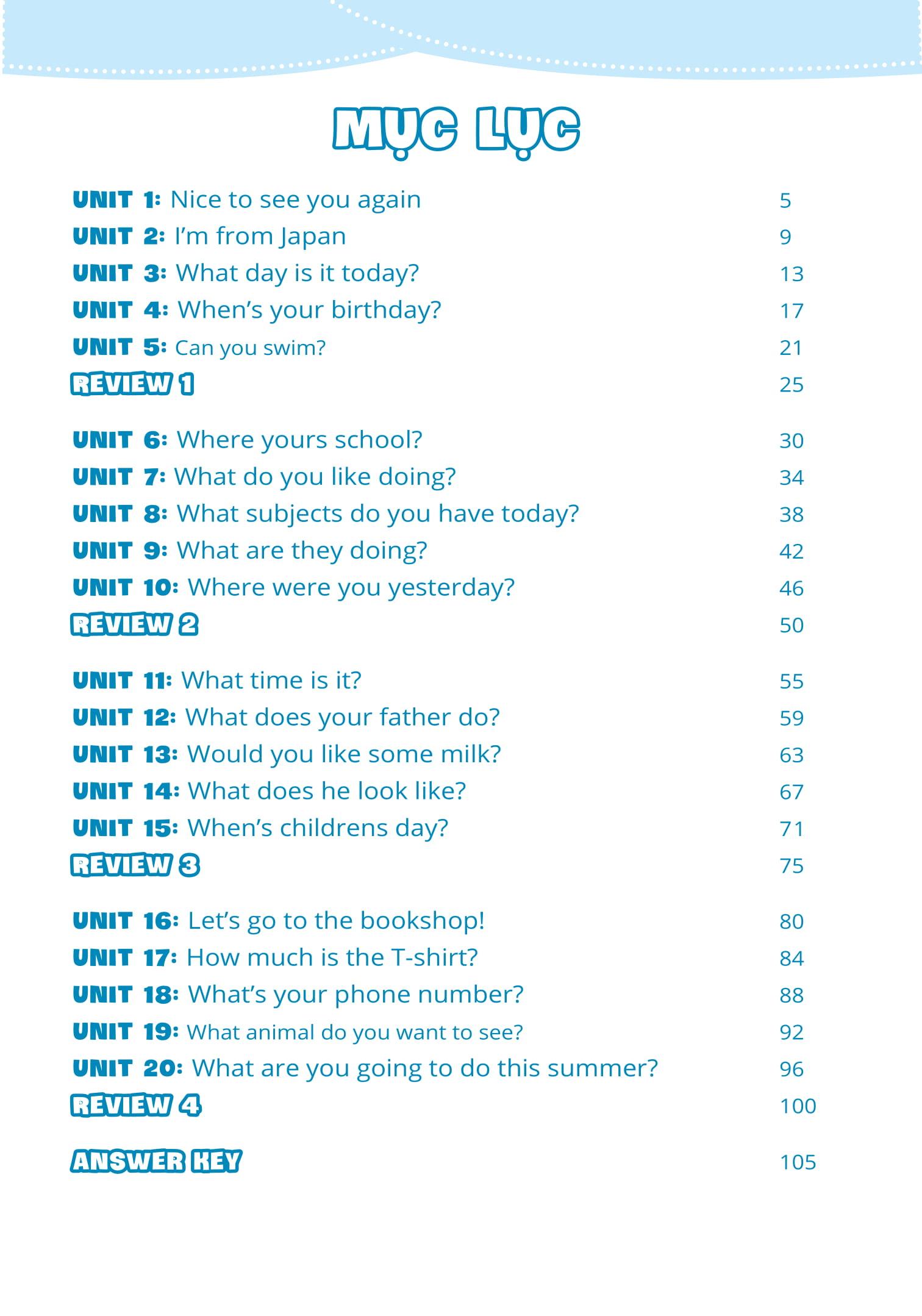 - Bài Review – Kiểm tra, đánh giá tổng hợp sau mỗi 5 Units Bài Review gồm các bài tập tổng hợp kiến thức của 5 Units vừa được học giúp các con kiểm tra, rà soát kiến thức hổng và thêm một lần học – nhớ kiến thức hiệu quả.