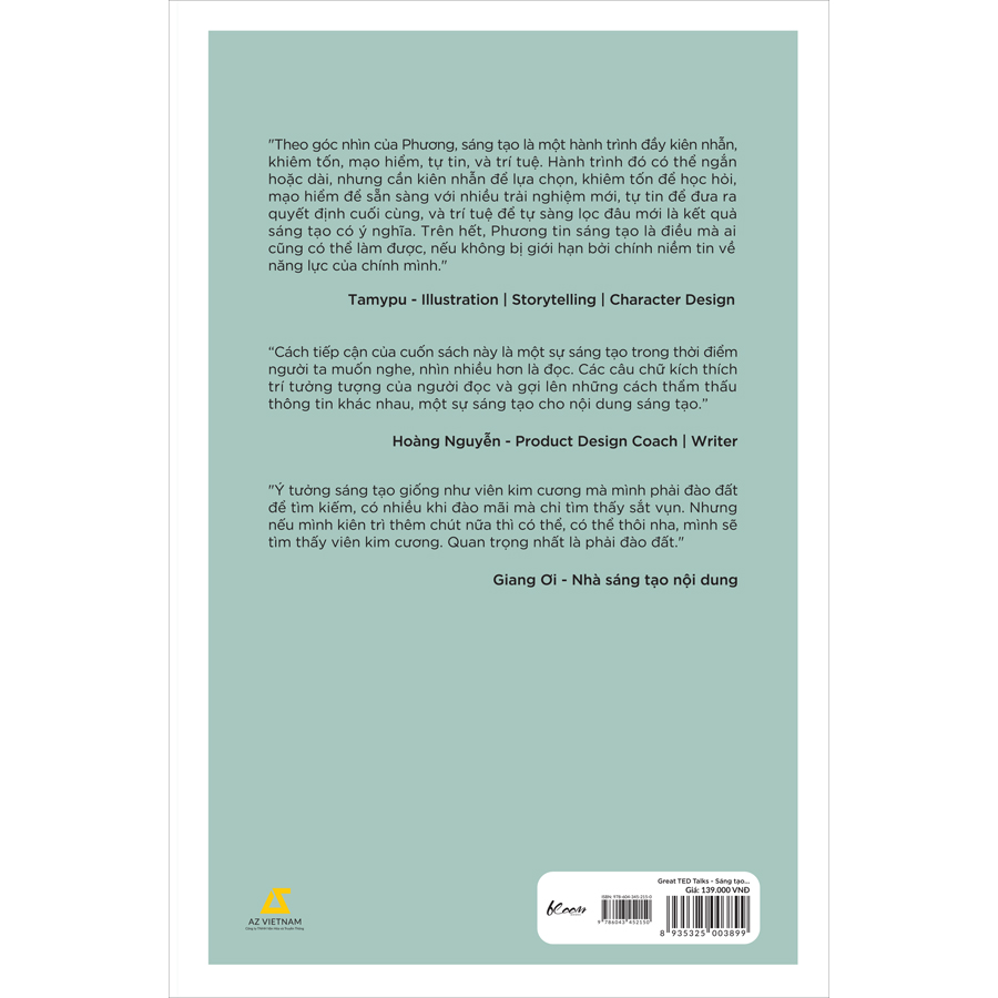 Great TED Talks: Sáng tạo trong thời đại mới - Phá vỡ quy chuẩn là cuốn “thực đơn” màu sắc gồm 100 lời khuyên được đúc kết từ 100 bài diễn văn TED hay nhất cho những người làm nghề sáng tạo. Cuốn sách đưa ra những ý tưởng có thể áp dụng vào bất cứ công việc nào yêu cầu tính sáng tạo, dù là nghệ thuật, sáng tạo nội dung, viết lách, vẽ minh họa, thiết kế, hoạt họa, làm nhạc, làm phim, diễn xuất – hoặc bất cứ công việc nào yêu cầu trí tưởng tượng, sự sáng tạo và tư duy vượt giới hạn.