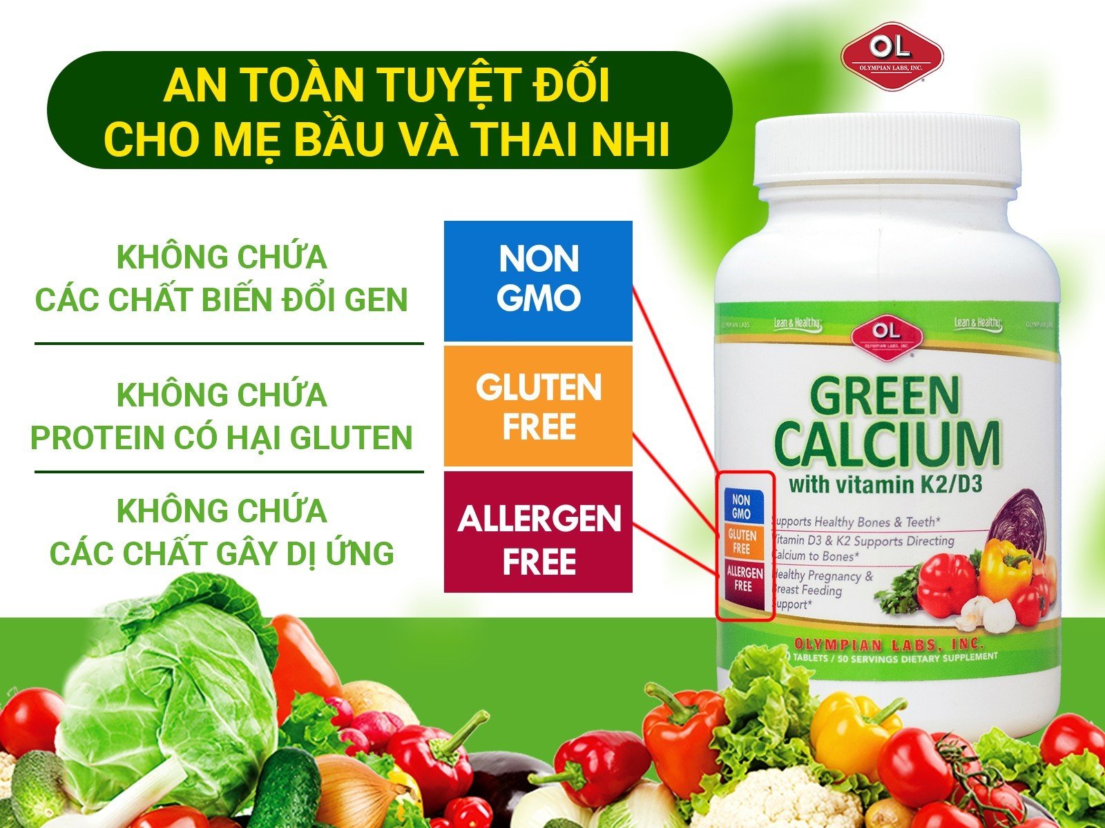 - ALLERGEN FREE: Không chứa các chất gây dị ứng. Mặt khác, Green Calcium được sản xuất từ nguồn nguyên liệu thực vật nên phù hợp với nhóm đối tượng ăn chay.