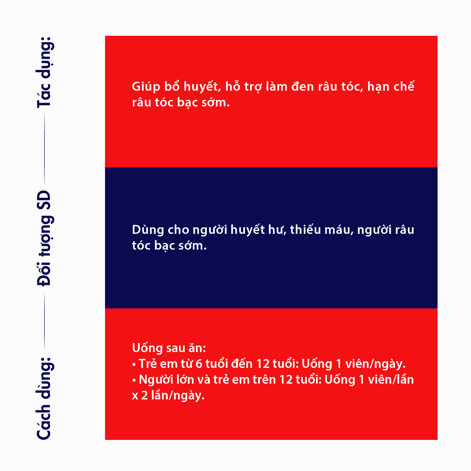 + Thành phần: Hà thủ ô đỏ…….. 200mg Bạch chỉ………... 100mg Calci carbonat…...75mg Hương phụ………10mg + Công dụng: Hỗ trợ bổ huyết, làm đen râu tóc + Đối tượng sử dụng: Người thiếu máu, râu