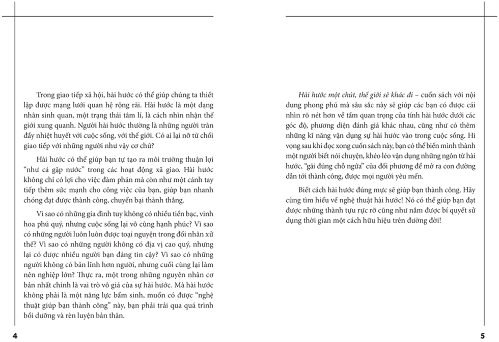 Hài hước một chút, thế giới sẽ khác đi – cuốn sách với nội dung phong phú mà sâu sắc này sẽ giúp các bạn có được cái nhìn rõ nét hơn về tầm quan trọng của tính hài hước dưới các góc độ, phương diện đánh giá khác nhau, cũng như có them những kĩ năng vận dụng sự hài hước vào trong cuộc sống. Hi vọng sau khi đọc xong cuốn sách này, bạn có thể biến mình thành một người biết nói chuyện, khéo léo vận dụng những ngôn từ hài hước, “gãi đúng chỗ ngứa” của đối phương để mở ra con đường dẫn tới thành công, được mọi người yêu mến.