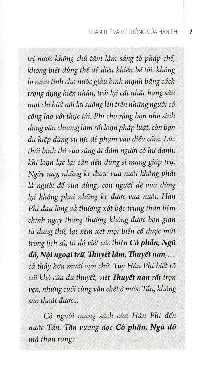 Cuốn sách do dịch giả Mặc Am dịch và biên soạn, tổng hợp những tư tưởng quan trọng của vị học giả lỗi lạc Hàn Phi Tử về vấn đề Pháp trị - Lấy Pháp làm kim chỉ nam cho sự trường tồn của một quốc gia, dân tộc.