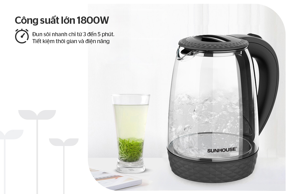 - Thân ấm làm bằng thủy tinh cao cấp trong suốt Ấm siêu tốc SUNHOUSE SHD1215B có kiểu dáng đẹp, sang trọng. Thân ấm bằng thủy tinh chịu nhiệt trong suốt, màu sắc trung tính, tính thẩm mỹ cao, không bị oxi hóa nên rất an toàn cho sức khỏe và tiện lợi khi vệ sinh. Đế, nắp và tay cầm làm bằng nhựa cao cấp, chống nóng tốt. Ấm mang diện mạo hiện đại, đẹp mắt.