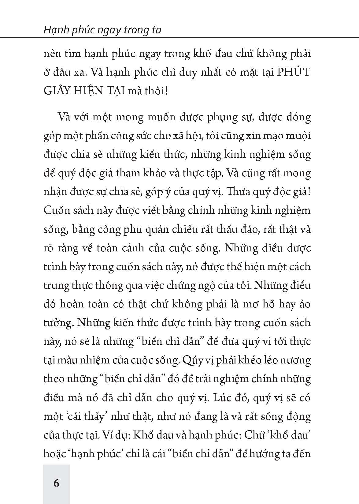 Chúng ta hay có một thói quen nghĩ rằng có một con đường dẫn đến khổ đau hay hạnh phúc. Xem khổ đau hay hạnh phúc như là một cái đích, một điểm cuối của một chặng đường, và đi hết con đường đó thì sẽ tới khổ đau hoặc hạnh phúc. Đó là cách nghĩ rất mơ hồ. Và một sự thật là: “Không có con đường nào dẫn đến khổ đau hay hạnh phúc, mà tự thân khổ đau và hạnh phúc chính là con đường!” Nếu là khổ đau thì con đường đó đầy rẫy những độc tố, phiền não và những cái bẫy “chết người”! Những cái bẫy được tạo nên một cách rất khéo léo và tinh vi, và chỉ cần bước một bước chân lên con đường đó là đã khổ ngay lập tức; bước một bước chân trên đó là đã chịu trận ngay rồi. Và hạnh phúc cũng vậy. Nếu là hạnh phúc thì chỉ cần bước một bước chân trên con đường đó thì cũng hạnh phúc ngay lập tức, chứ không cần phải đi hết con đường.