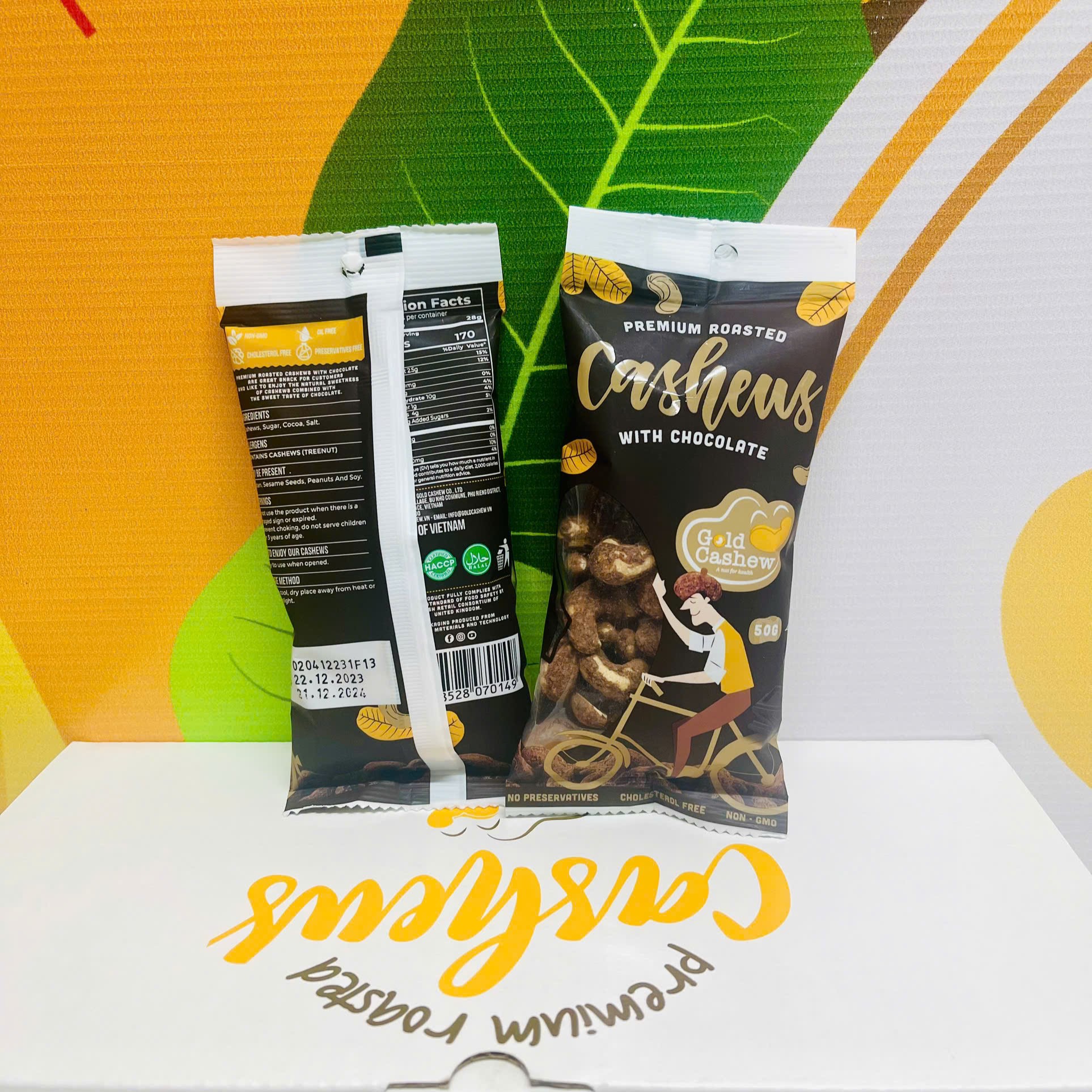 - Đặc điểm nổi bật của sản phẩm Công nghệ RANG KHÔNG DẦU tiên tiến, giữ trọn hương vị tự nhiên và chất dinh dưỡng có trong hạt điều và không gây ngán. Phương pháp RANG TINH THỂ MUỐI hạn chế tối đa lượng muối dư thừa, tốt cho sức khoẻ và người ăn kiêng. Là nguồn bổ sung SẮT, MAGIE và KALI tuyệt vời cho cơ thể Không chứa CHOLESTEROL – Cholesterol Free. Không sử dụng THỰC PHẨM BIẾN ĐỔI GEN (Non-GMOs) Không CHẤT BẢO QUẢN – No Preservatives. Duy nhất và chỉ có hạt điều size W320 được chọn lọc, chế biến theo tiêu chuẩn Quốc tế của Hiệp Hội Bán Lẻ Anh Quốc – BRC Food, US FDA và chứng nhận VSATTP Việt Nam Được chọn lọc kỹ càng từ những hạt điều đã tách vỏ lụa, theo tiêu chuẩn w320 kết hợp cùng muối biển tinh thể, Hạt Điều Rang Socola Cao Cấp GOLD CASHEW chắc chắn sẽ làm hài lòng các fan ruột của hạt điều với vị giòn và béo ngậy tự nhiên của hạt điều kết hợp với sự đậm đà từ cacao và muối biển.