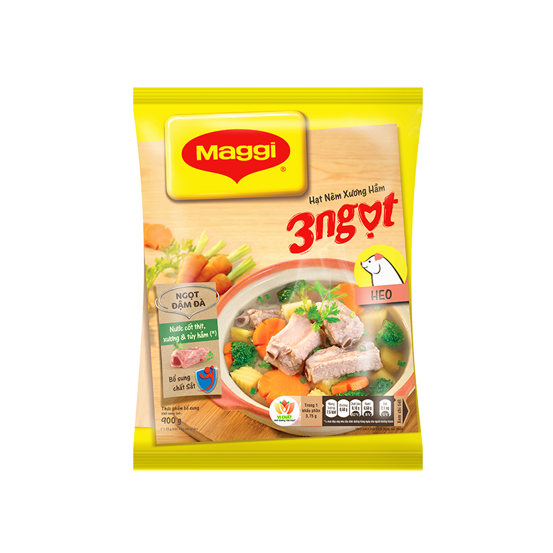- Hạt nêm Maggi 3 ngọt heo với chiết xuất từ nước cốt thịt, xương và tủy hầm.