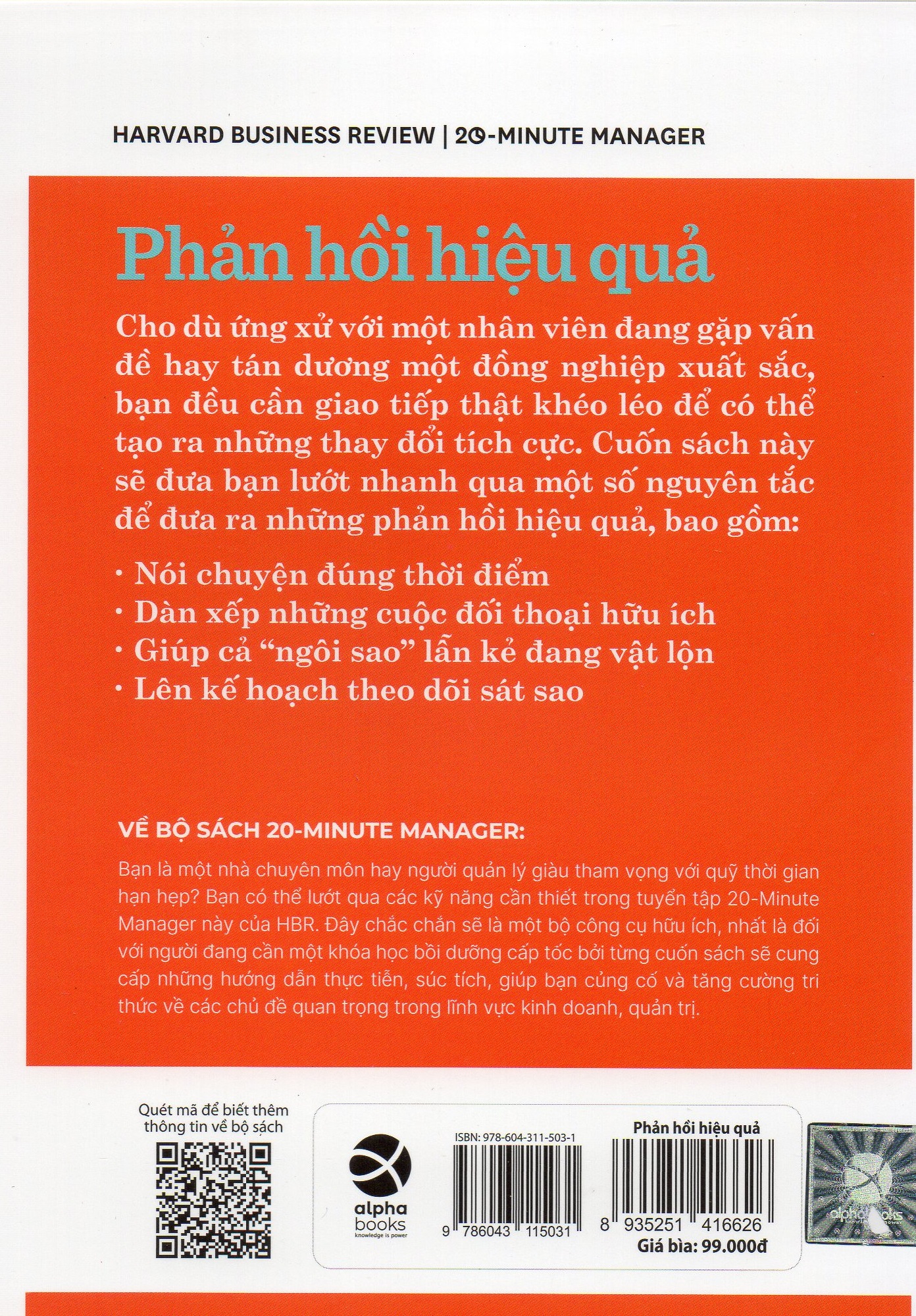 Cho dù ứng xử với một nhân viên đang gặp vấn đề hay tán dương một đồng nghiệp xuất sắc, bạn đều cần giao tiếp thật khéo léo để có thể tạo ra những thay đổi tích cực. Cuốn sách này sẽ đưa bạn lướt nhanh qua một số nguyên tắc để đưa ra những phản hồi hiệu quả, bao gồm: