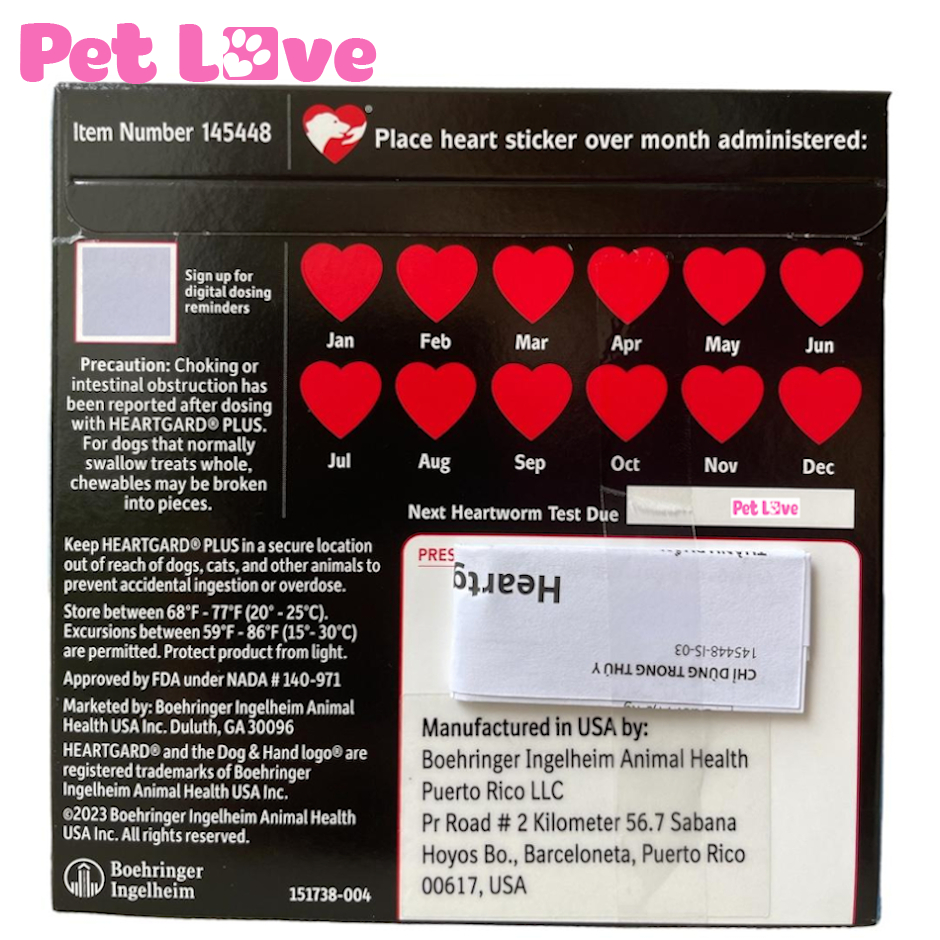 – Nên cho ăn hàng tháng, nhất là những lúc cao điểm trong năm, khi muỗi mang ấu trùng giun tim hoạt động mạnh. Liều ban đầu nên cấp trong vòng 30 ngày sau khi chó bị muỗi đốt lần đầu. Và liều cuối cùng phải cấp trong vòng 1 tháng sau khi chó bị muỗi đốt lần cuối. Để đạt hiệu quả tối đa, nên dùng Heartgard mỗi 30 ngày.