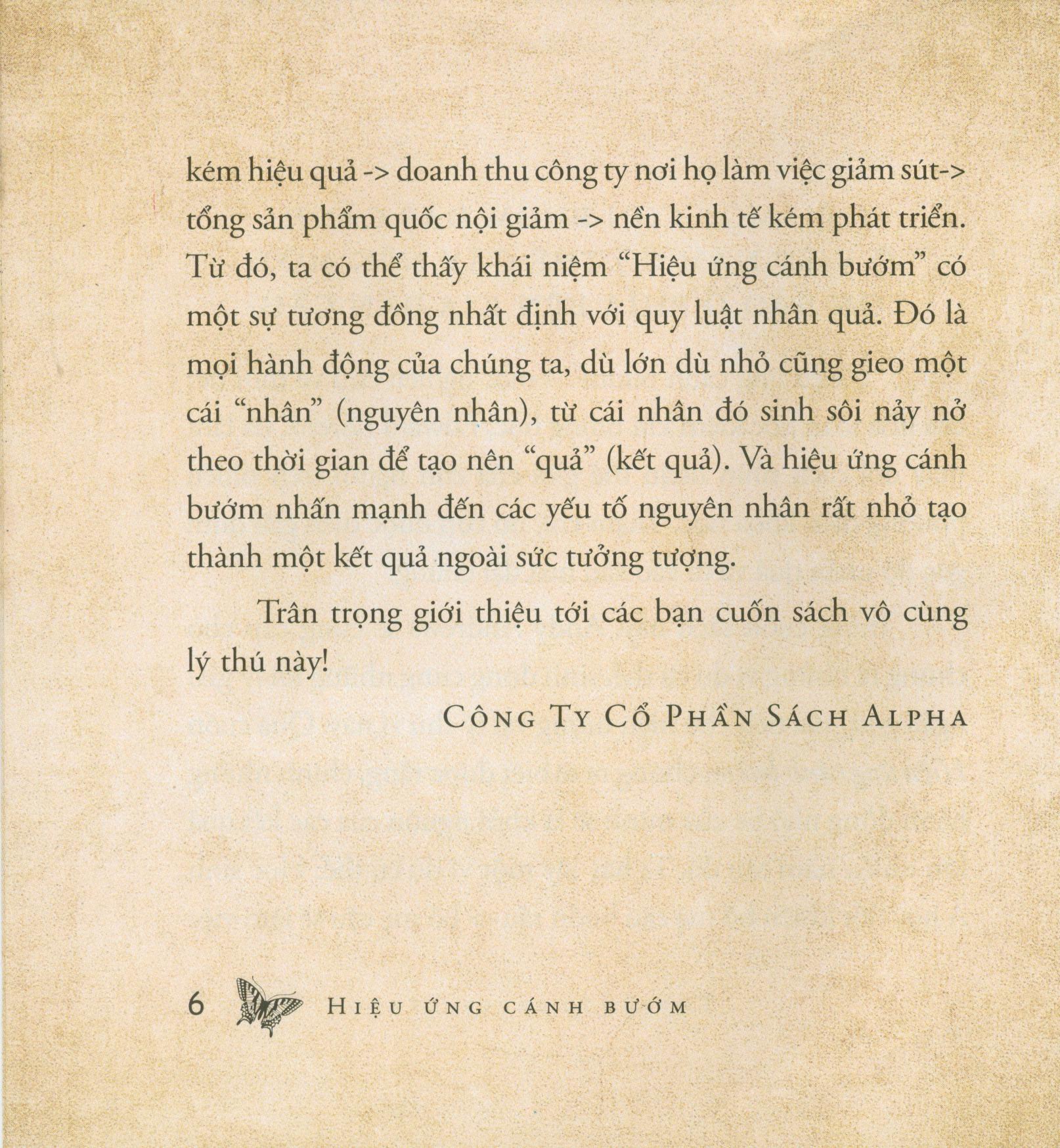 Trong cuốn sách Hiệu Ứng Cánh Bướm này, Andy Andrews sẽ cung cấp cho chúng ta những ví dụ, cụ thể, sinh động cùng những lời lý giải ngắn gọn, súc tích cho hiện tượng vật lý thú vị này. Chúng ta sẽ biết rằng, chính những hành động nhỏ bé của mình sẽ là khởi nguồn của các kết quả lớn nhiều năm sau đó.