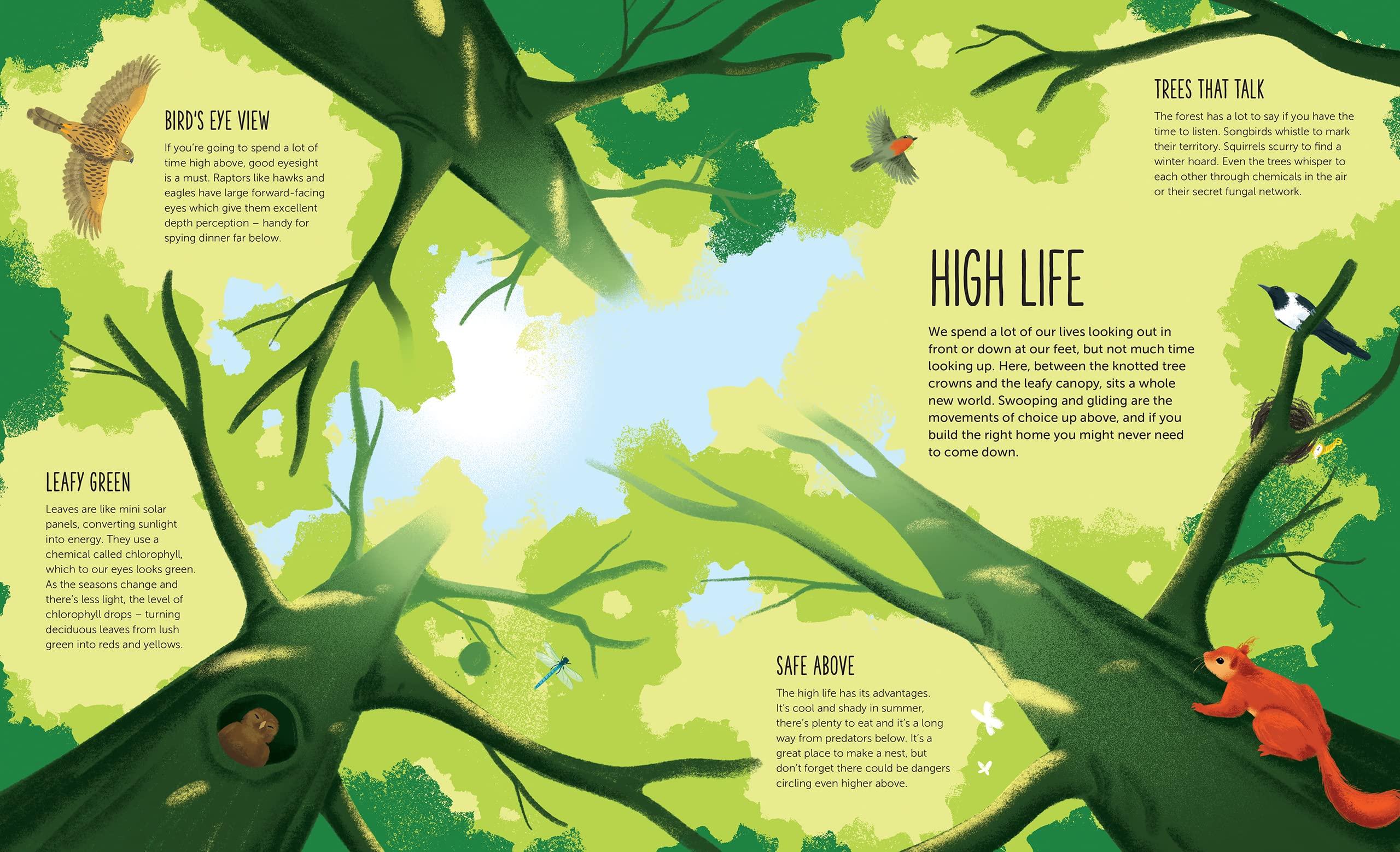 High is an illustrated non-fiction book that explores the natural world above us and the efforts humans have made to venture high above the Earth, from early flying machines to modern skyscrapers. Linking seemingly diverse subject matter, it invites the reader to explore the wonder of the universe.