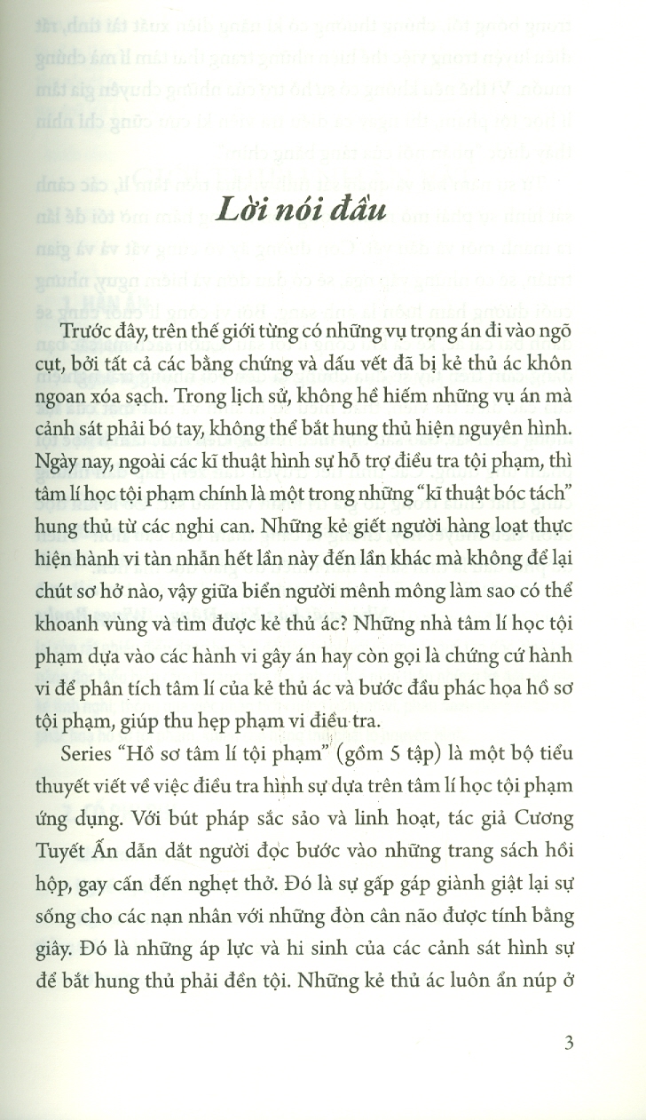 Series HỒ SƠ TÂM LÍ TỘI PHẠM (gồm 5 tập) là một bộ tiểu thuyết viết về việc điều tra hình sự dựa trên tâm lí học tội phạm ứng dụng. Với bút pháp sắc sảo và linh hoạt, tác giả Cương Tuyết Ấn dẫn dắt người đọc bước vào những trang sách hồi hộp, gay cấn đến nghẹt thở. Đó là sự gấp gáp giành giật lại sự sống cho các nạn nhân với những đòn cân não được tính bằng giây. Đó là những áp lực và hi sinh của các cảnh sát hình sự để bắt hung thủ phải đền tội. Những kẻ thủ ác luôn ẩn núp ở trong bóng tối, chúng thường có kĩ năng diễn xuất tài tình, rất điêu luyện trong việc thể hiện những trạng thái tâm lí mà chúng muốn. Vì thế nếu không có sự hỗ trợ của những chuyên gia tâm lí học tội phạm, thì ngay cả điều tra viên kì cựu cũng chỉ nhìn thấy được “phần nổi của tảng băng chìm”.