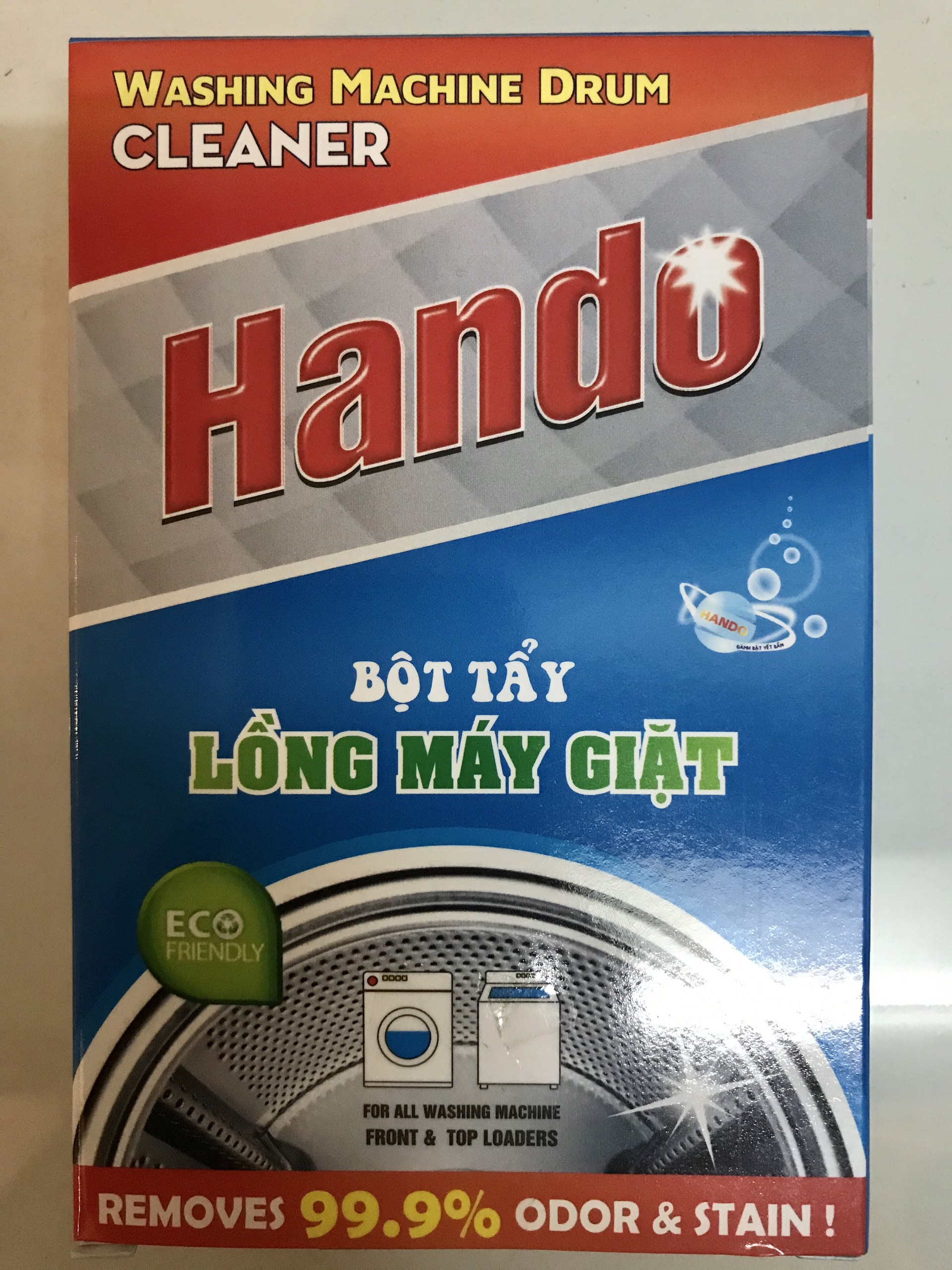 Thông tin sản phẩmTên sản phẩm : Tẩy lồng máy giặt HandoHướng dẫn sử dụng : Cho 2 đến 3 gói nhỏ bột vào lượng nước khoảng 1/6 thùng giặt, sau đó ngâm 4 đến 10 tiếng và xả hết nước đi.Thành phần : NaOH - H202, phụ gia, chất hoạt động bề mặtCông dụng : Làm sạch lồng giặtHướng dẫn bảo quản : Bảo quản nơi thoáng mát, tránh tầm tay trẻ nhỏQuy cách : HộpKhối lượng tịnh : 200gkích thước hộp : 13,5x8,5x3,5Xuất xứ : Việt Nam