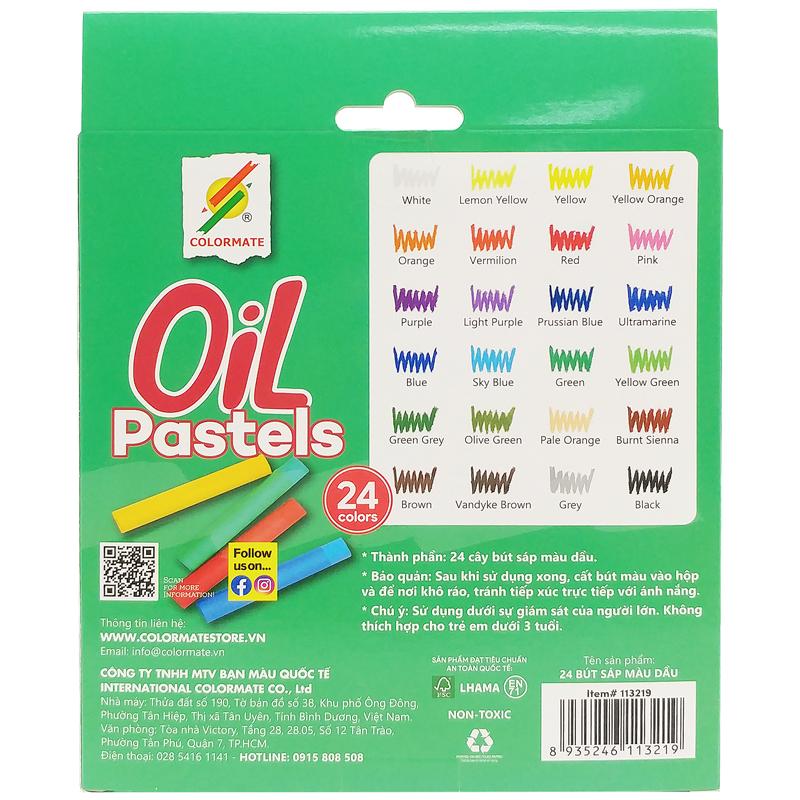 Hộp 24 Bút Sáp Màu Dầu - Colormate 113219 Bút màu vẽ ở dạng sáp dầu, mềm và mịn hơn rất nhiều so với dạng sáp thường, nên cho màu đậm và tươi sáng. Sản