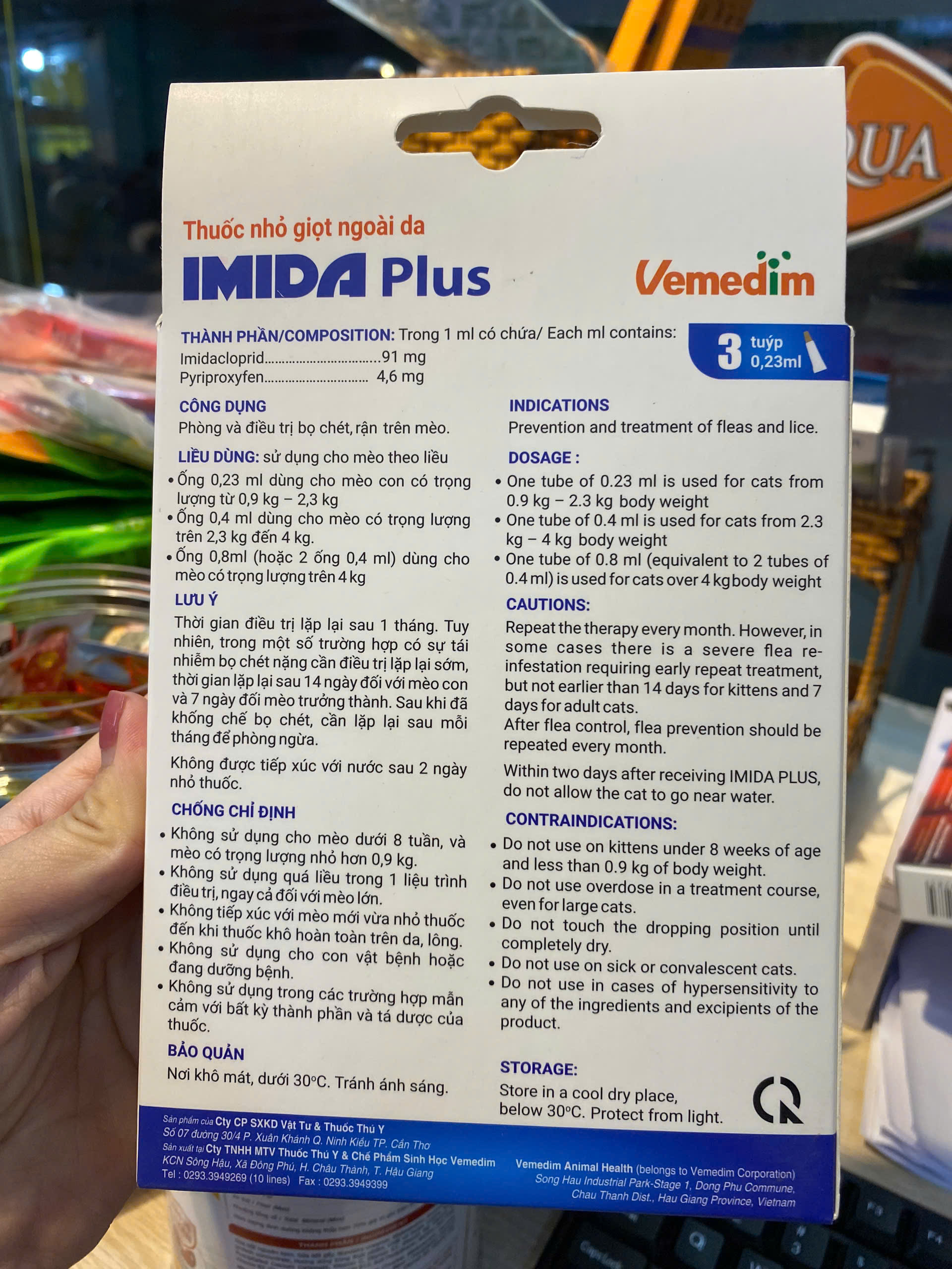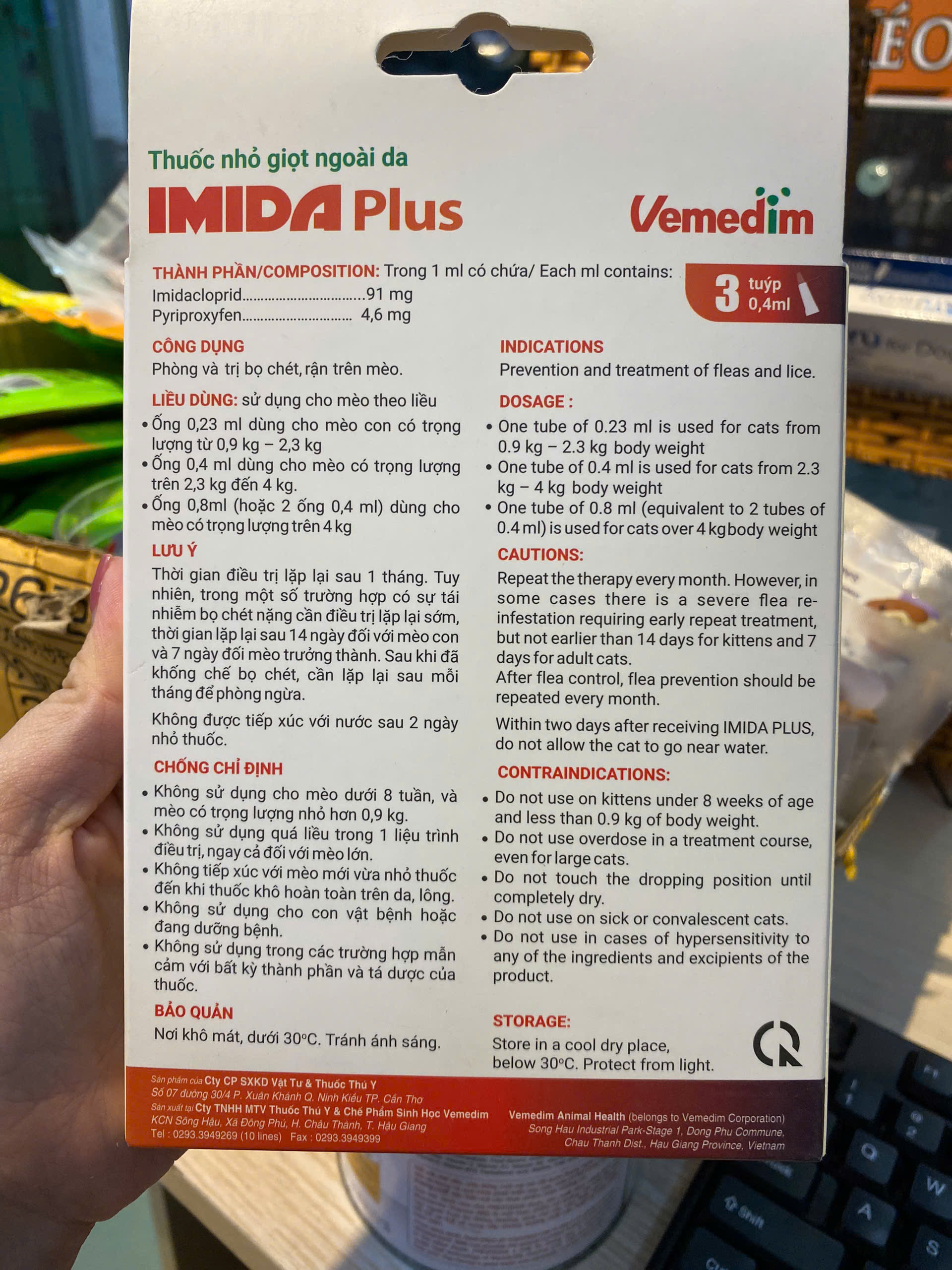 Vemedim Imida Plus for cat dùng ngoài da diệt bọ chét, bọ nhảy, ve rận cho mèo, tác động nhanh sau 12 giờ, 1 hộp 3 tuýp THÀNH PHẦN: Trong 1 ml có chứa: Imidacloprid…………………………...91